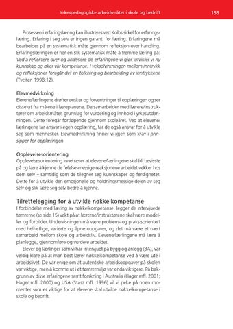 Prosessen i erfaringslæring kan illustreres ved Kolbs sirkel for erfaringslæring. Erfaring i seg selv er ingen garanti for læring. Erfaringene må bearbeides på en systematisk måte gjennom refleksjon over handling. Erfaringslæringen er her en slik systematisk måte å fremme læring på: Ved å reflektere over og analysere de erfaringene vi gjør, utvikler vi ny kunnskap og øker vår kompetanse. I vekselvirkningen mellom inntrykk og refleksjoner foregår det en tolkning og bearbeiding av inntrykkene (Tveiten 1998:12). Elevmedvirkning Elevene/lærlingene drøfter ønsker og forventninger til opplæringen og ser disse ut fra målene i læreplanene. De samarbeider med lærere/instruktører om arbeidsmåter, grunnlag for vurdering og innhold i yrkesutdanningen. Dette foregår fortløpende gjennom skoleåret. Ved at elevene/ lærlingene tar ansvar i egen opplæring, tar de også ansvar for å utvikle seg som mennesker. Elevmedvirkning finner vi igjen som krav i prinsipper for opplæringen. Opplevelsesorientering Opplevelsesorientering innebærer at elevene/lærlingene skal bli bevisste på og lære å kjenne de følelsesmessige reaksjonene arbeidet vekker hos dem selv – samtidig som de tilegner seg kunnskaper og ferdigheter. Dette for å utvikle den emosjonelle og holdningsmessige delen av seg selv og slik lære seg selv bedre å kjenne.
