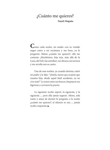 omo cada noche, mi madre con su vestido negro entra a mi recámara y me besa, yo le pregunto: Mamá ¿cuánto me quieres?, ella me contesta: ¡Muchísimo, hija mía, más allá de la Luna, del Sol y las estrellas!, me abraza con ternura y me arrulla con su canto. Una de esas noches, ya cuando dormía, entró mi padre y le dijo: “¡Estela, tienes que aceptar que nuestra hija, desde aquel fatal accidente, ya no vive más!” La tomó entre sus brazos, limpiaron sus lágrimas y cerraron la puerta. La siguiente noche esperé, la siguiente, y la siguiente…, pero ella jamás regresó. Ahora, sola canto y antes de dormir le pregunto a la noche ¿cuánto me quieres?, el silencio se oye…, jamás recibo respuesta.❧
