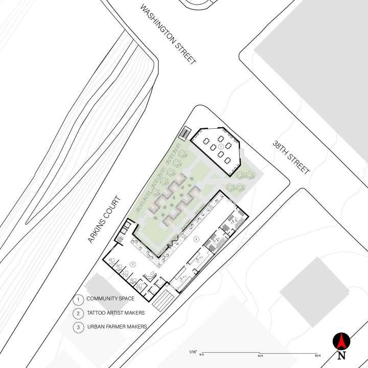This project was inspired by designing a live and work space that served the professions of urban farming and tattoo artists. Their collaborative relationships with clients and community are what led to choosing these professions. For example, urban farming provides food resources and tattoos are a form of storytelling through art. In order to connect the link of environment in the space the form was inspired by interlocking and to embrace a center gathering space. Art and nature work together to create a space that draws communities together to live, work, and explore the area.
