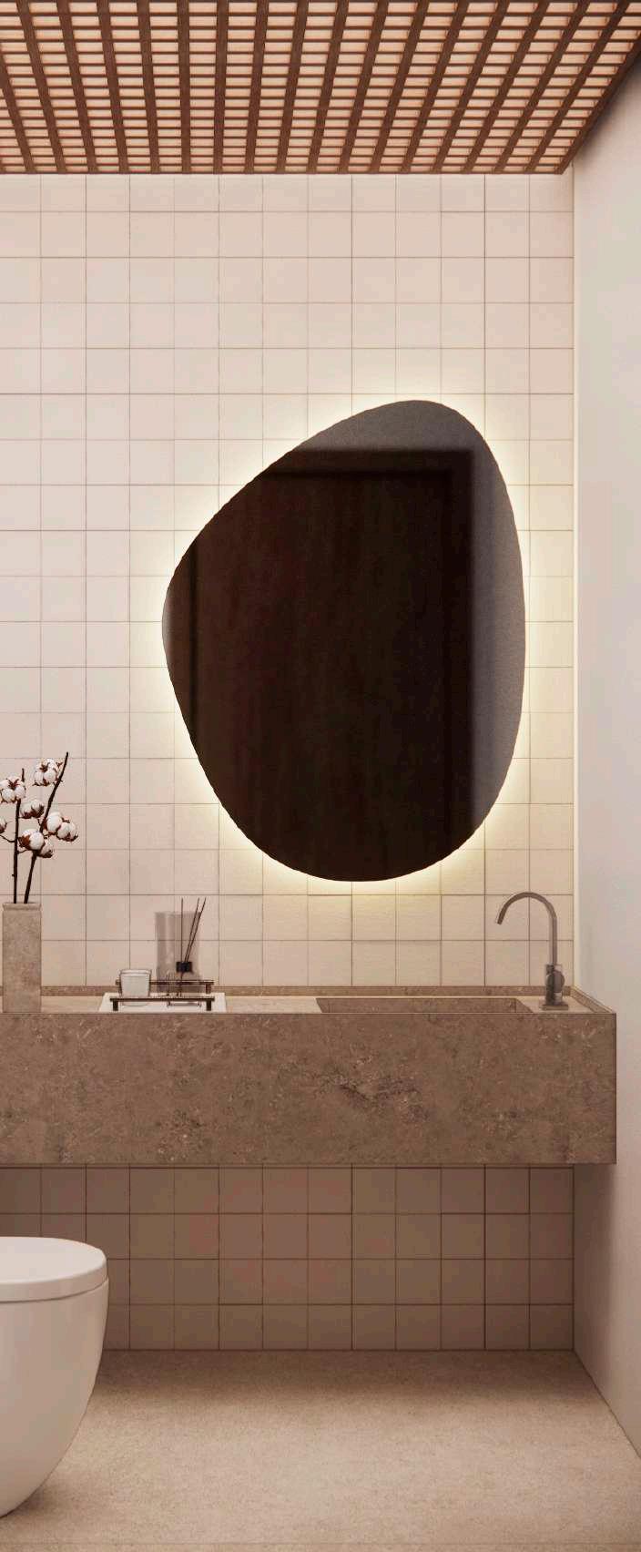 Com materiais cuidadosamente selecionados, iluminação estratégica e atenção aos detalhes, o resultado final é um lavabo que cativa os sentidos, proporcionando uma experiência de puro requinte e conforto em menos de 3m². O mármore imperial, com sua textura delicada e padrões únicos, foi selecionado para compor a bancada do lavatório. Além disso, o revestimento em travertino foi a escolha ideal para as paredes. Suas nuances terrosas e suaves conferem uma sensação de conforto e serenidade.