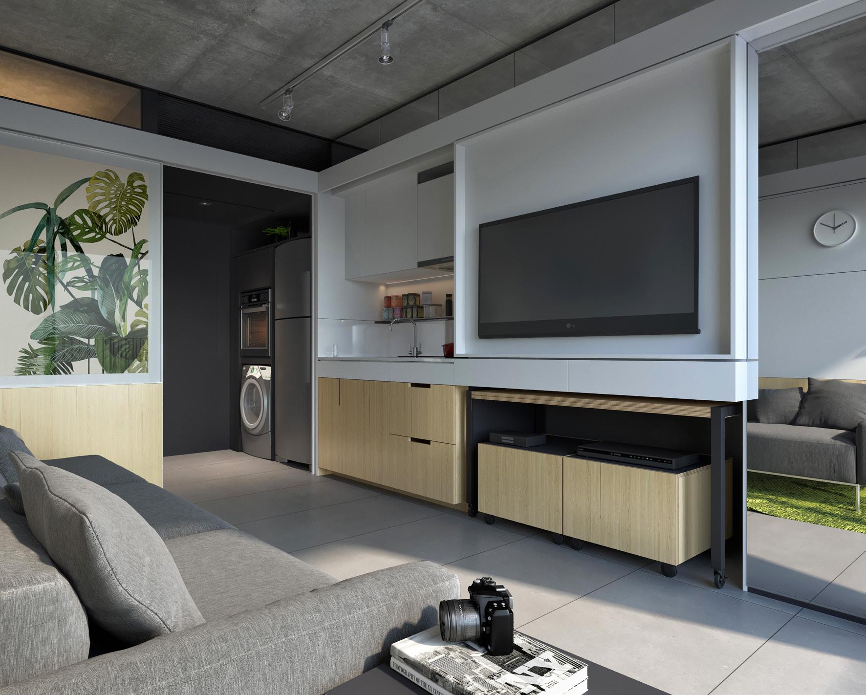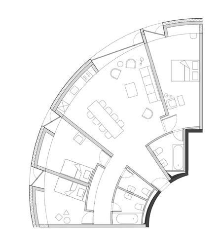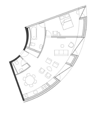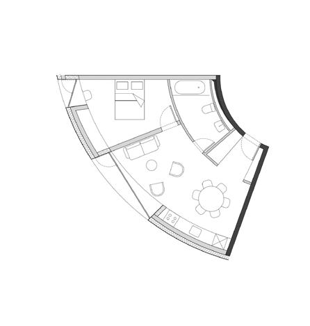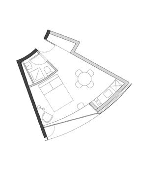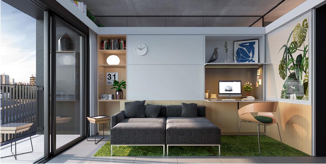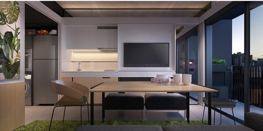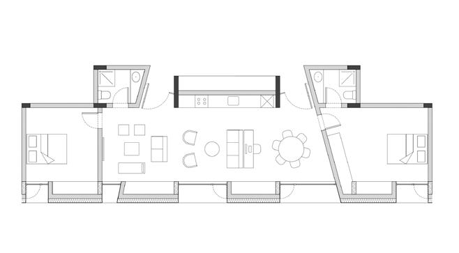 para proporcionar o máximo de flexibilidade aos pavimentos tipo das edificações, as áreas de apoio se aglutinam em faixas bem definidas: internamente e junto às circulações verticais, as faixas condensam as áreas molhadas; enquanto externamente e junto às fachadas, as faixas condensam armários e bancadas, proporcionando proteção da incidência solar através da profundidade das fenestrações.