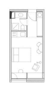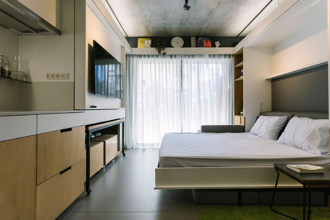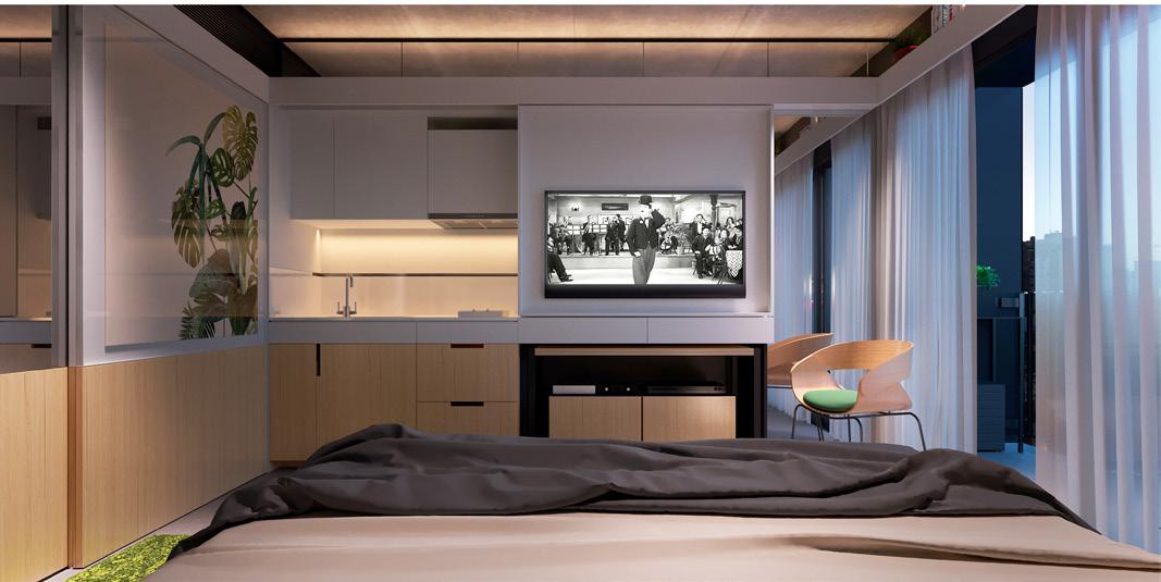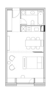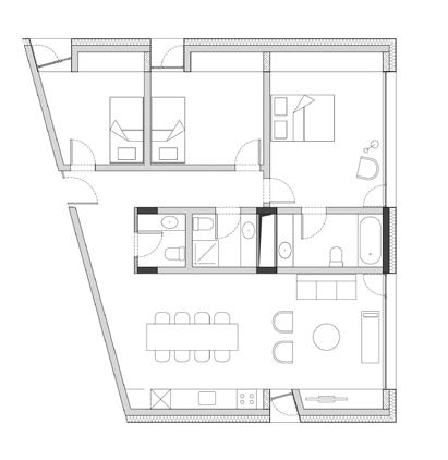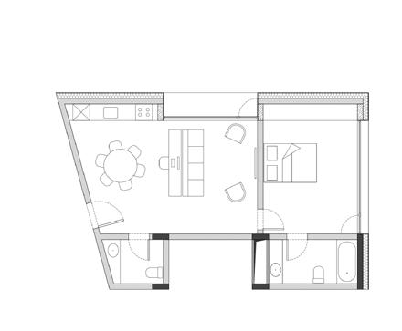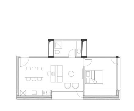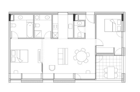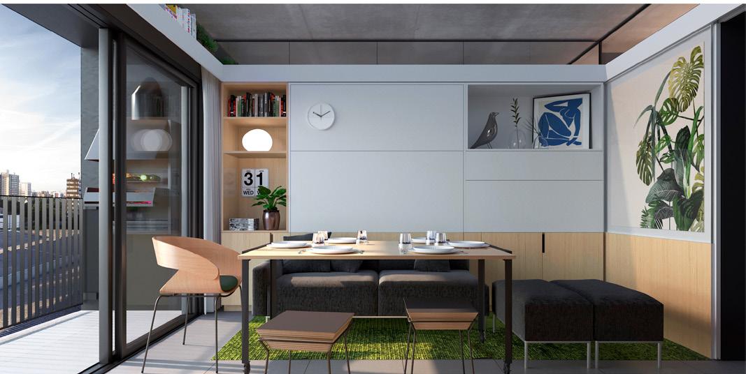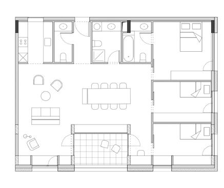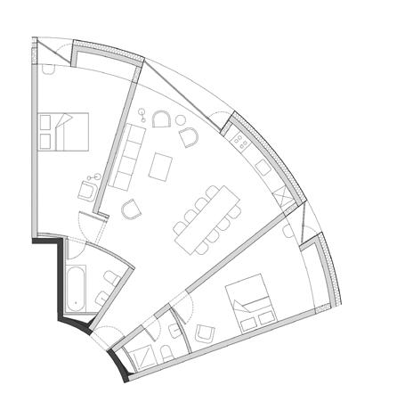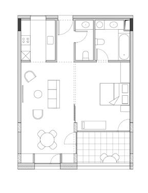 para proporcionar o máximo de flexibilidade aos pavimentos tipo das edificações, as áreas de apoio se aglutinam em faixas bem definidas: internamente e junto às circulações verticais, as faixas condensam as áreas molhadas; enquanto externamente e junto às fachadas, as faixas condensam armários e bancadas, proporcionando proteção da incidência solar através da profundidade das fenestrações.