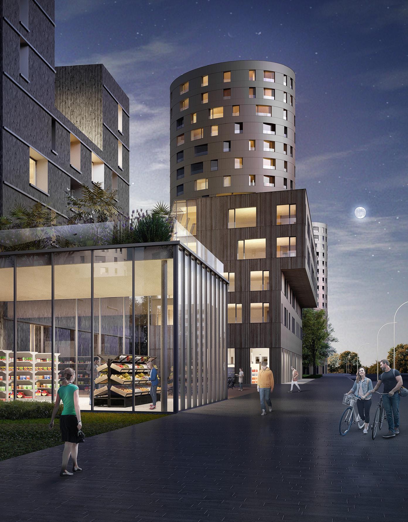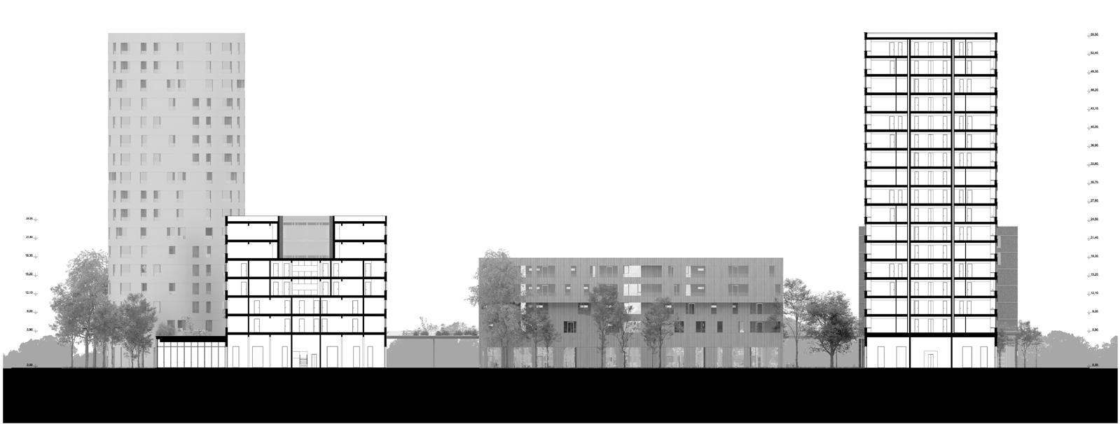 Quanto à arquitetura, a composição respeita a expressão plástica e qualidades materiais de cada edificação ao mesmo tempo que cria identidades por manipulações sutis no arranjo de os elementos. A proposta de estrutura mista de concreto e madeira serve um uso mais lógico de materiais locais renováveis. Os planos são flexíveis, utilizando as fachadas como sistemas não só de iluminação e ventilação, mas também para soluções de armazenamento, mesas e balcões. As áreas úmidas são linearmente dispostas, racionalizando a construção e deixando amplas zonas livres para os espaços principais dos apartamentos, conferindo não só flexibilidade para alterações de layout dentro das unidades, mas também para reorganizações inteiras de pavimentos, permitindo a edifícios para suportar mudanças de demanda em prazos muito mais longos.