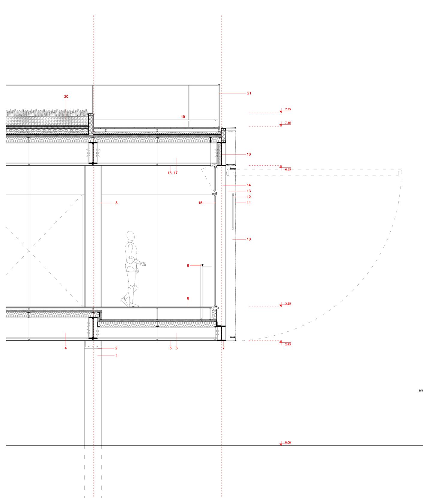 pilar em concreto armado in loco 40x40cm chapa para fixação da estrutura metálica perfil ‘I’ metálico 40x40cm perfil ‘I’ metálico 50x20cm forro em chapa metálica dobrada de aço patinado escurecido perfil ‘I’ metálico 30x15cm perfil ‘I’ metálico 35x20cm piso nível 3.25cm piso elevado em concreto celular pré-moldado piso elevado em concreto celular pré-moldado; laje painel wall e=55mm; estrutura para suporte painel wall perfil ‘I’ 12x7,5cm; isolamento térmico em lã de rocha guarda corpo em perfil ‘T’ 7,5x5cm apoiado por barra chata metálica e=1cm quadro metálico articulado chapa de alumínio expandido pistão hidráulico perfil ‘T’ metálico 15x20cm perfil ‘I’ metálico 15x20cm esquadria de alumínio perfil ‘I’ metálico 55x20cm perfil ‘I’ metálico 50x20cm forro em chapa metálica dobrada de aço patinado escurecido cobertura