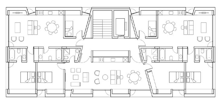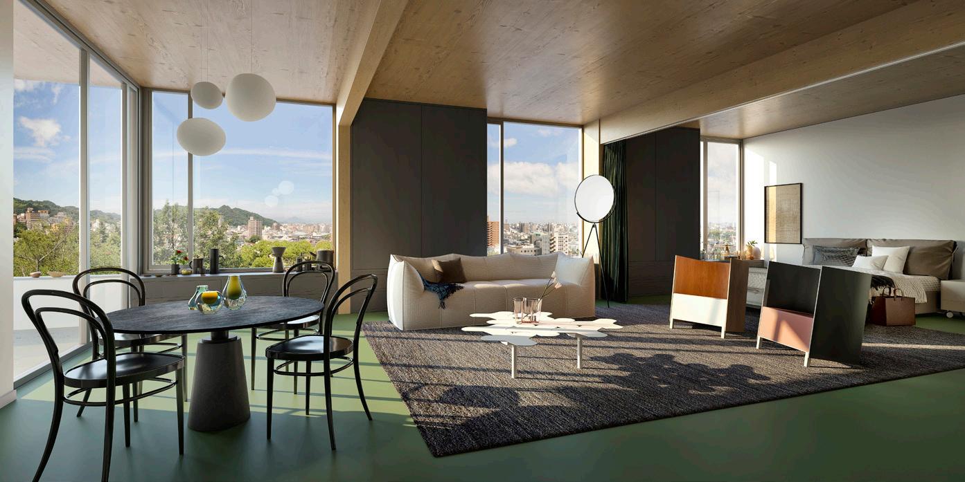 O edifício tipo Urban Villa é estruturado primordialmente por um sistema de vigas em MLC, que transmite as cargas aos pilares de MLC, a algumas paredes de CLT das fachadas e ao núcleo vertical de concreto. As lajes são todas de CLT.
