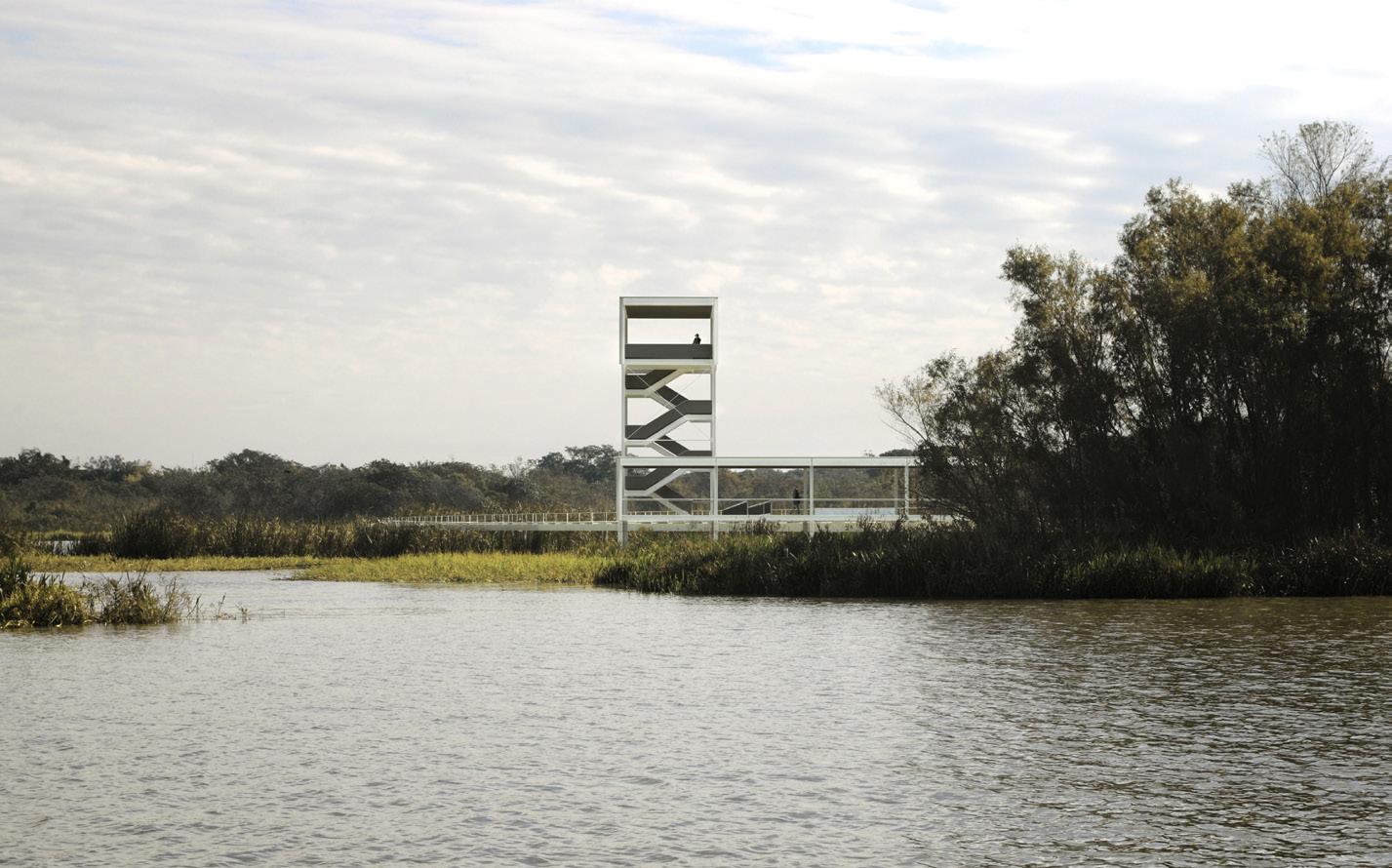 os grandes vãos reduzem a pegada da trilha elevada no solo módulo refúgio e torre mirante combinam-se para apreciar o bioma dos sacos