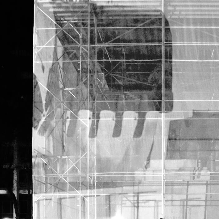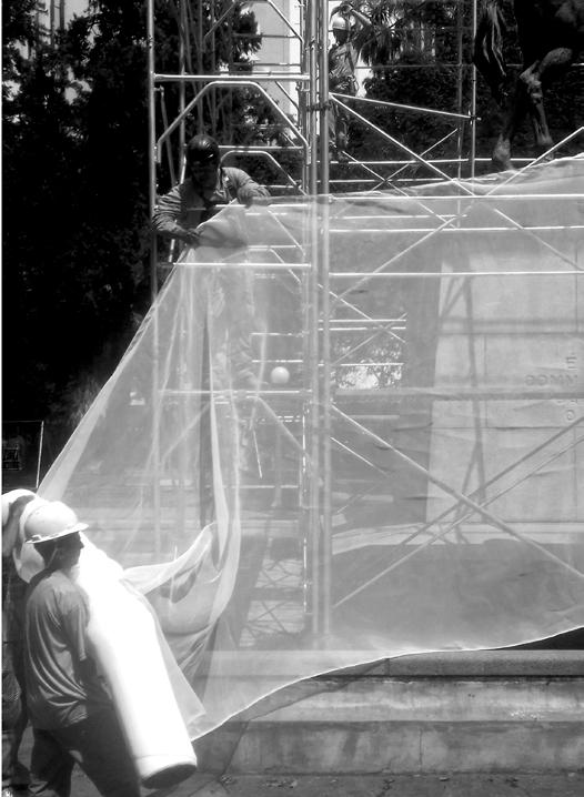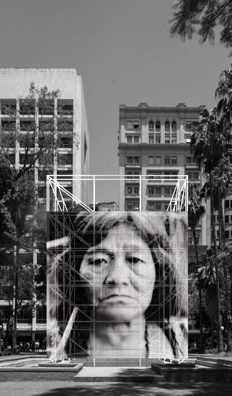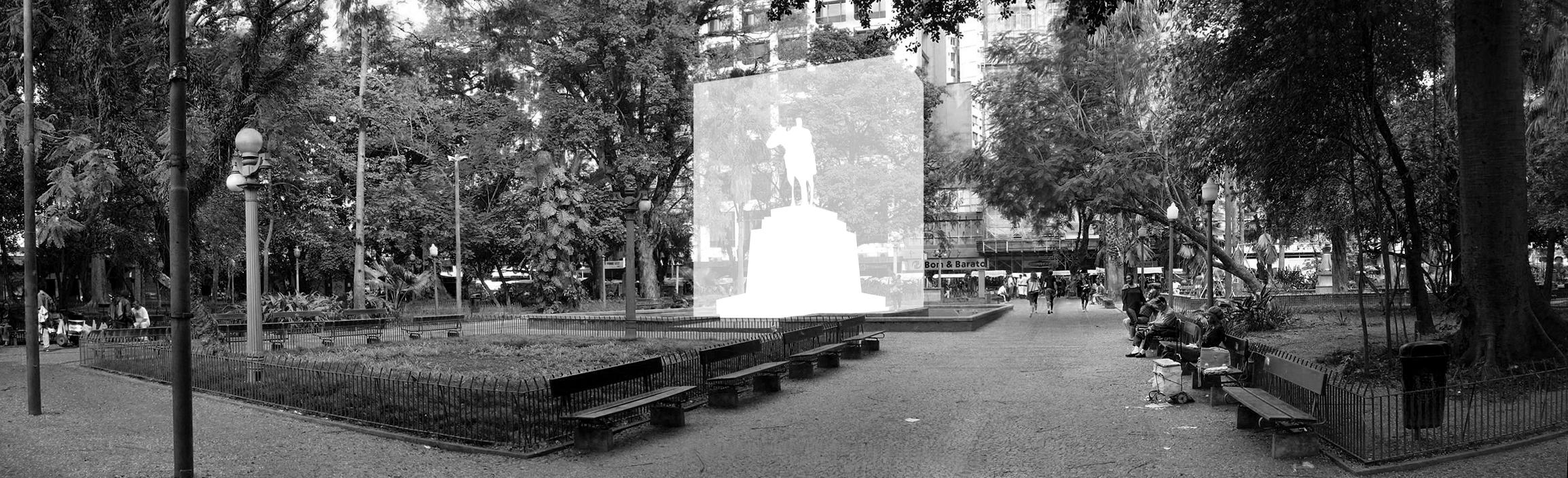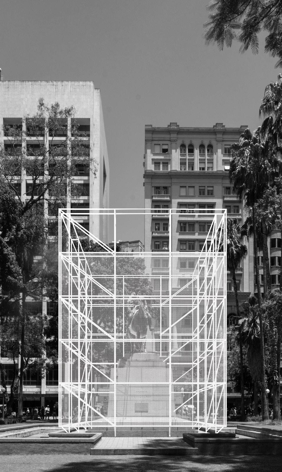 Para propor uma experiência democrática do espaço-sede do evento, intentou-se aqui gerar uma situação na qual múltiplas possibilidades para a reedição da história do lugar sejam possíveis. Através da adição de um monolito branco semitransparente ao redor da estátua sem a tocar, deslocamos seu status permanente e incontestável pelo caráter expositivo da materialidade em construção. A utilização da estrutura de andaimes na intervenção corrobora a tradução da linguagem arquitetônica da construção de sentido na visualidade. Sua presença concreta, semidespida e reveladora da estátua pré-existente, agrega significado. O uso de ready-mades industriais relacionados com o cotidiano da construção e manutenção das estruturas urbanas desloca-se de seu lugar da não-arte para a experiência estética, de modo a convidar o espectador-participante a reconsiderar o trabalho dos agentes envolvidos, a força de trabalho e as relações presentes na interdiscursividade da produção do espaço.