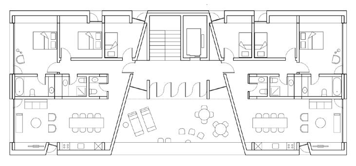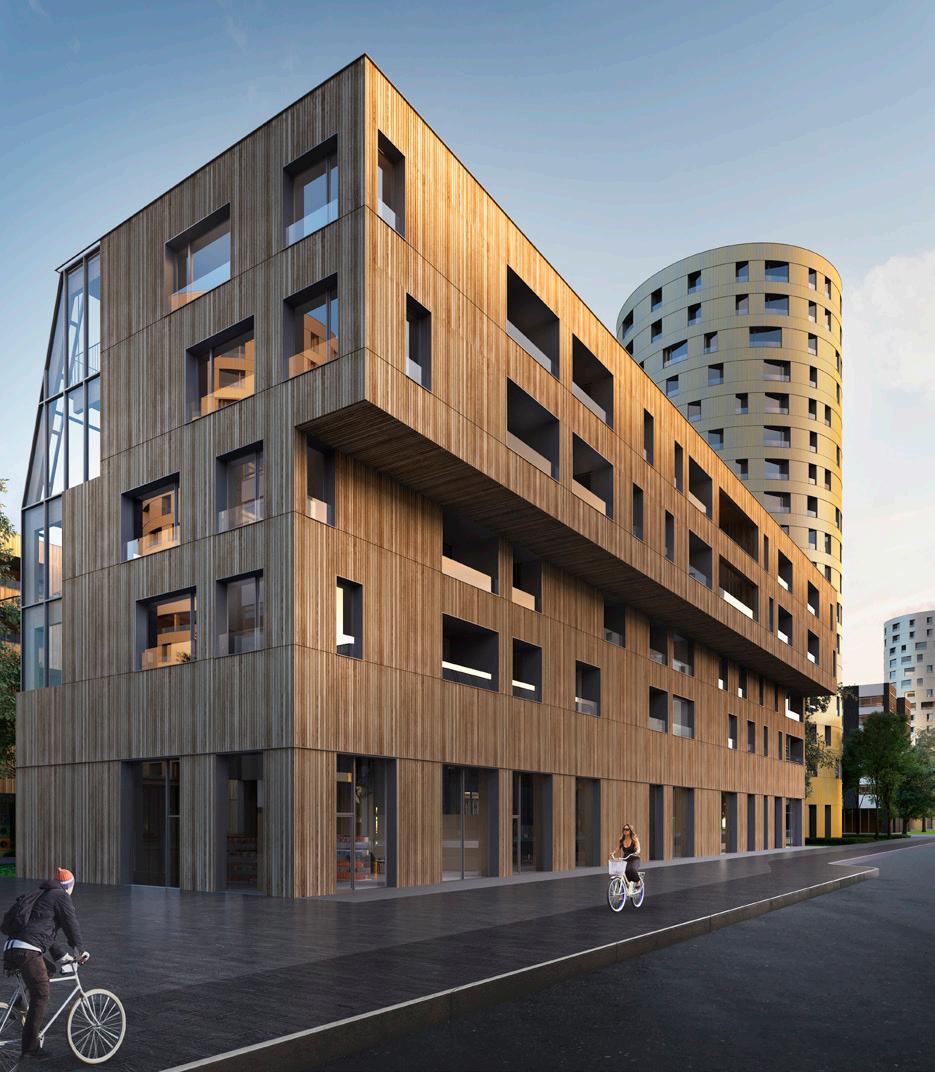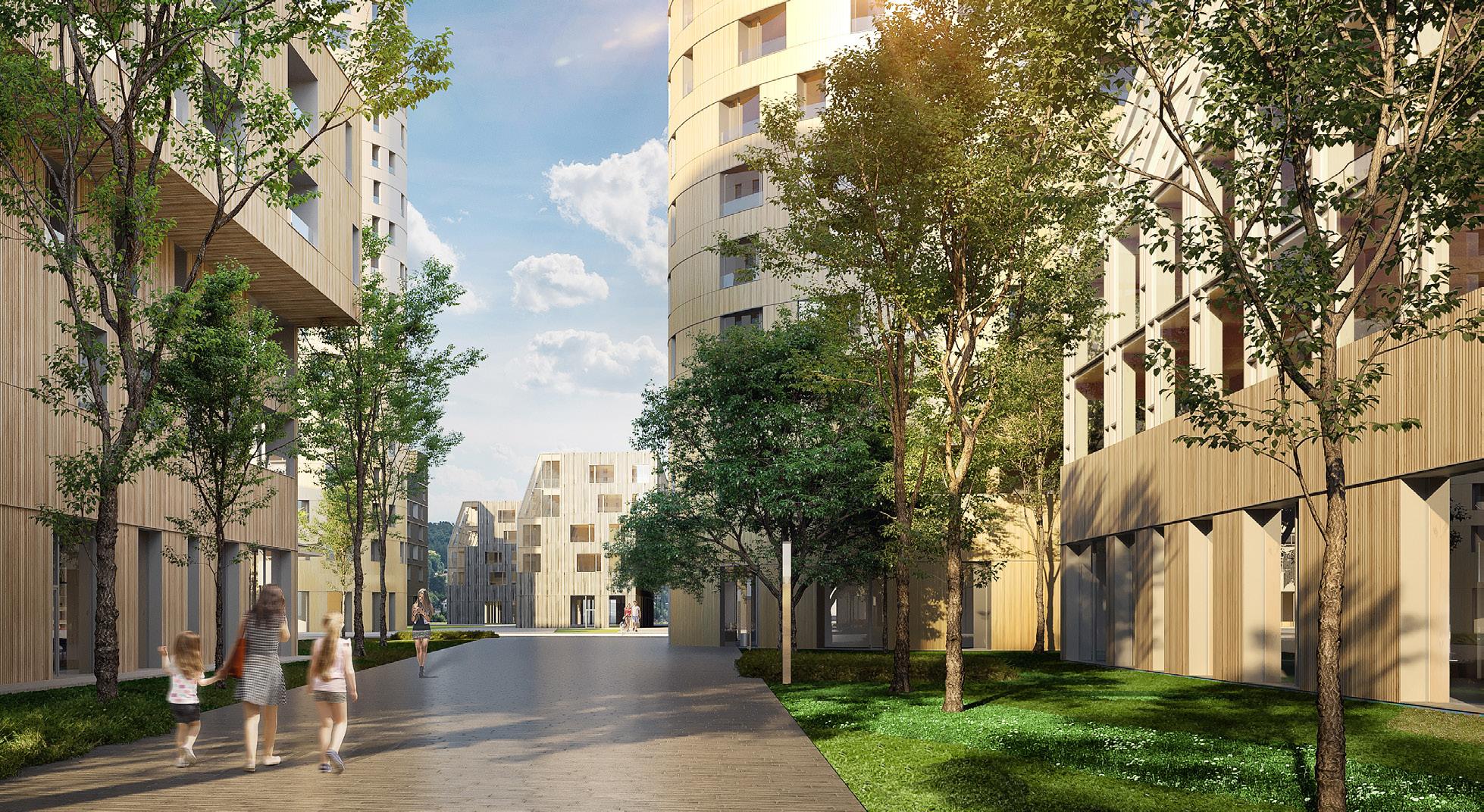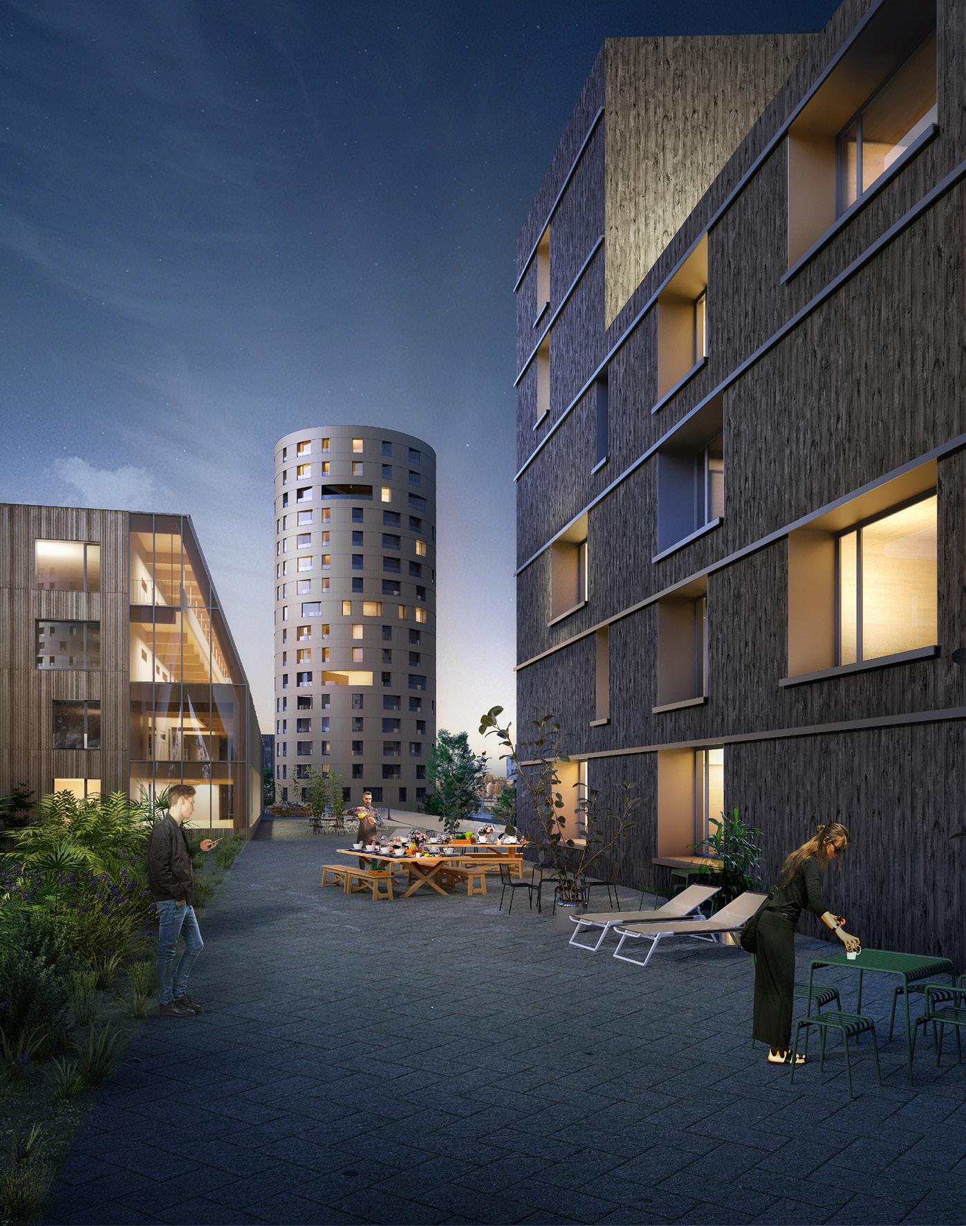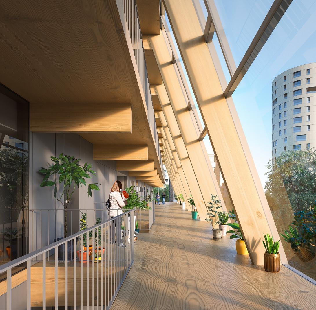 As divisões internas são compostas por painéis leves de vedação, visando obter a flexibilidade arquitetônica almejada. Os núcleos de concreto armado nas circulações verticaisconstituem uma barreira contra a propagação de incêndios nas rotas de fuga e contribuem significativamente com os sistemas de contraventamento dos edifícios. Todos os elementos de madeira são protegidos do contato direto com o solo, utilizando-se fundações de concreto armado.