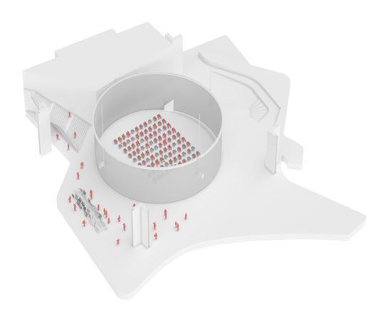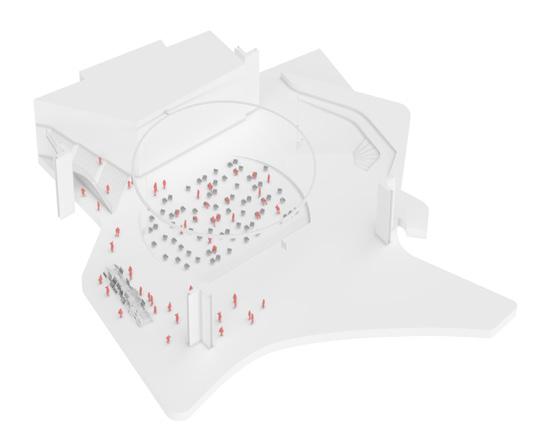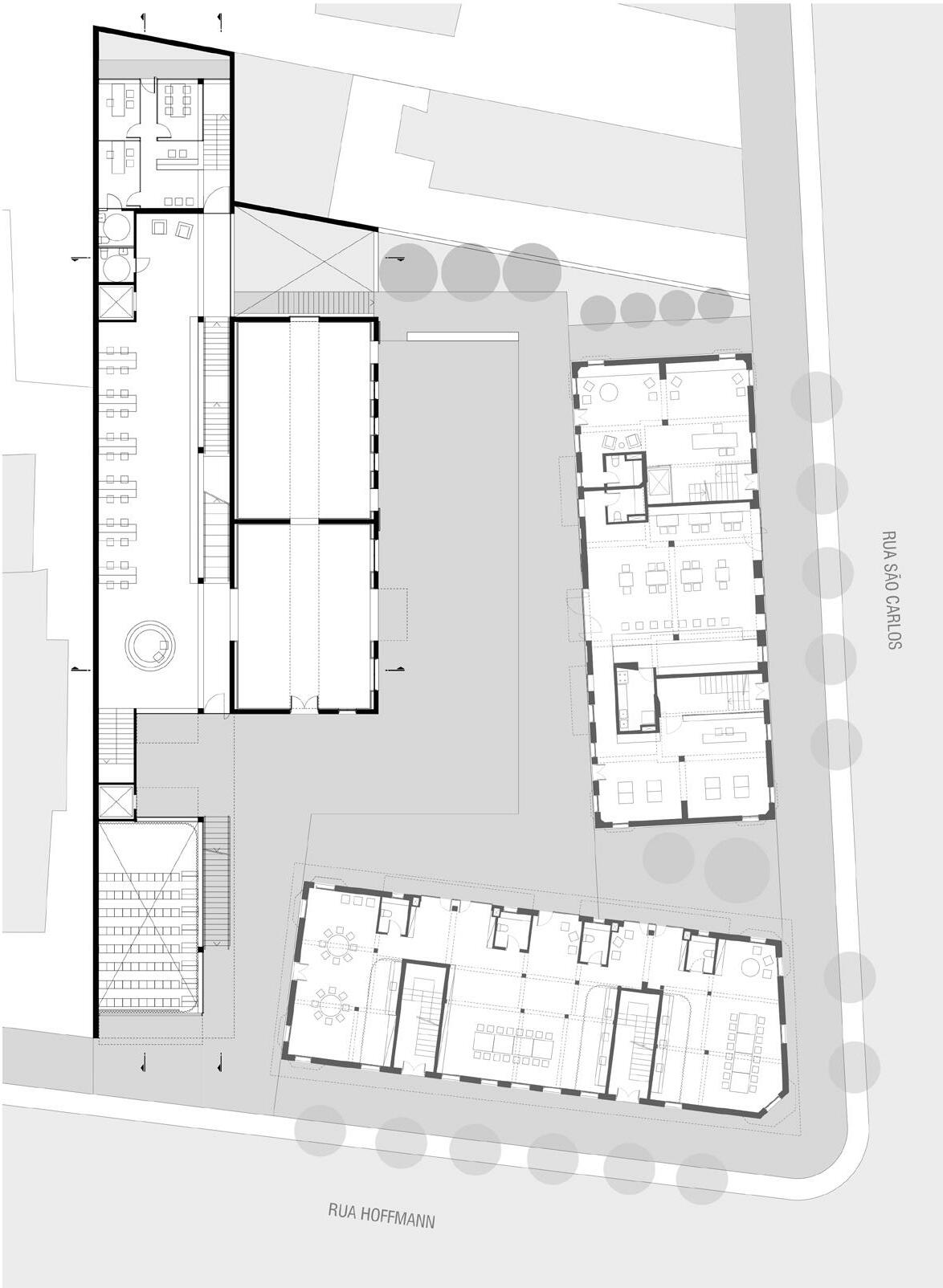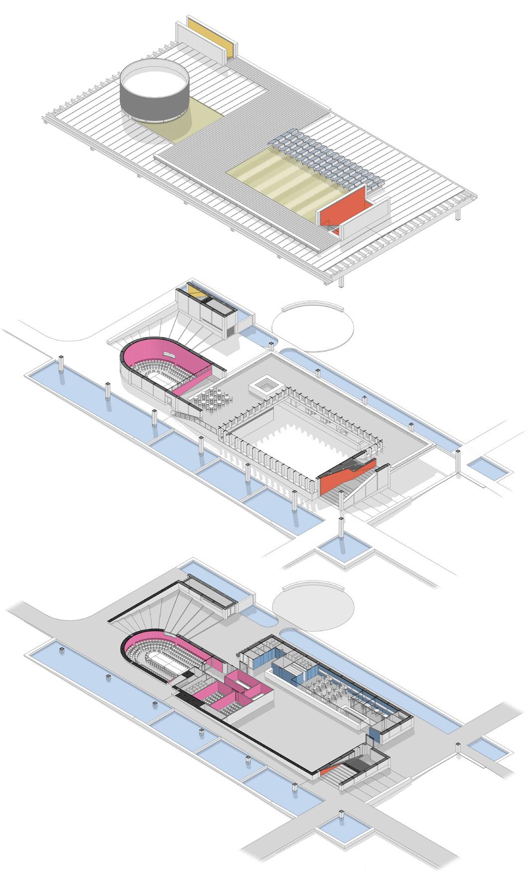 Como o local costuma abrigar atividades simultâneas, o projeto tem como premissa principal dotar de autonomia as diferentes partes do programa: o pavimento térreo dos edifícios lindeiros às vias receberão