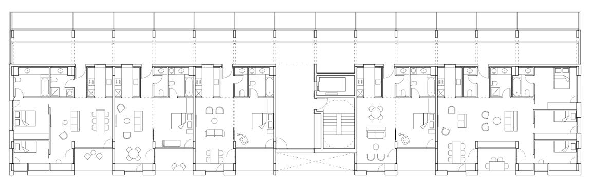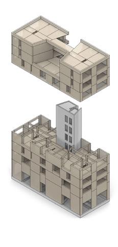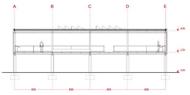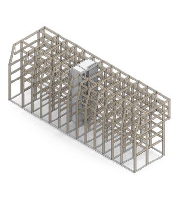O edifício tipo Gallery apresenta uma disposição linear e é estruturado primordialmente por pórticos transversais em elementos de MLC, que garantem o contraventamento na menor direção. Um núcleo de concreto conectado aos pórticos por vigas longitudinais em MLC garantem o travamento na outra direção.