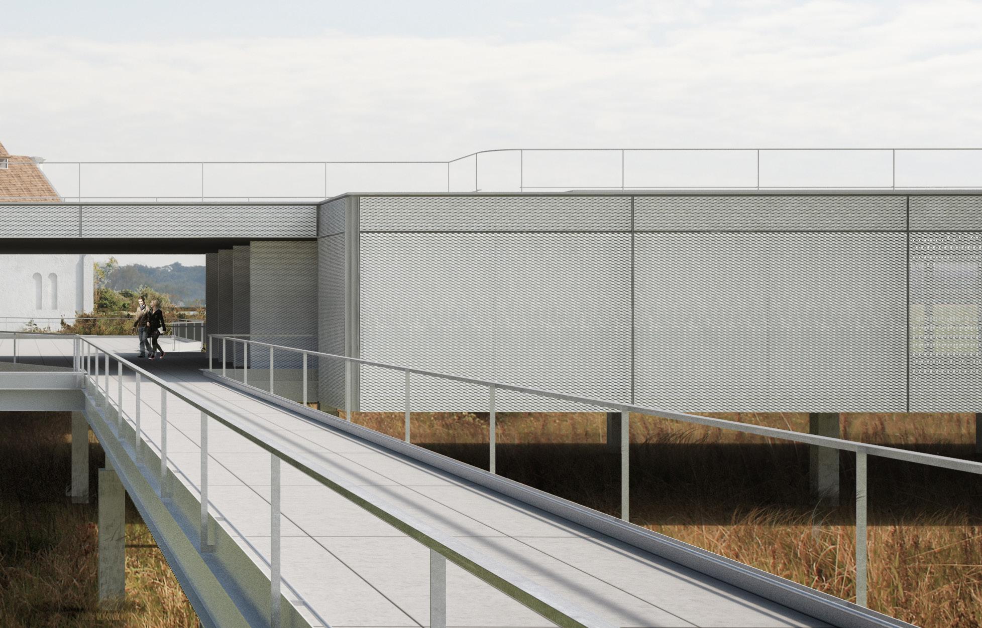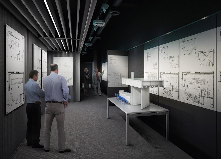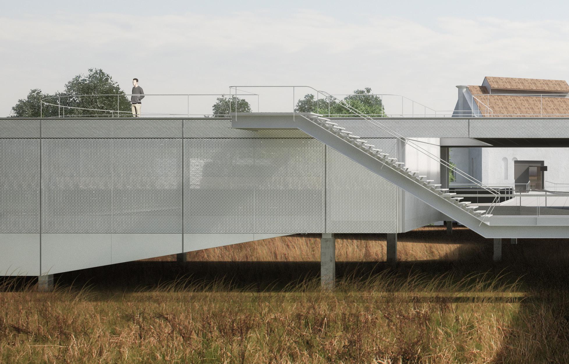 o percurso que leva à cobertura da casa inclui grandes varandas acomodadas sobre as zonas de pé-direito comum do térreo concatenadas ao circuito de visitação. se prevê um espaço para exposições sobre o tema e a instalação de um pequeno bar de apoio para visitantes.