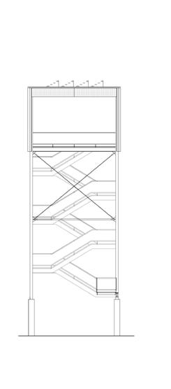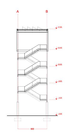 mezanino: as escadarias que levam à cobertura funcionam também como núcleos de contraventamento estrutural. aberturas para a casa de bombas responsável por levar a água filtrada pelos jardins aos reservatórios superiores, localizada sob a escadaria que leva à cobertura, reforçam o caráter didático da construção.