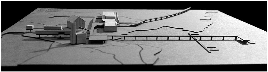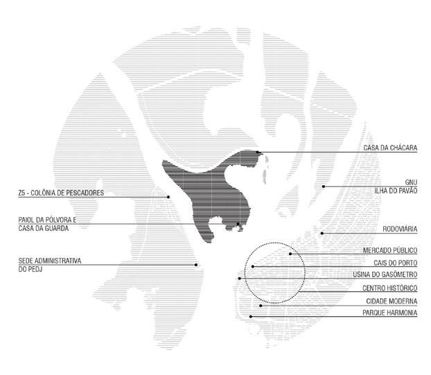 fotos da maquete de estudos da intervenção no sul da ilha e da torre da casa de guarda vista a partir da ilha da pintada mapa demonstrando os principais equipamentos no entorno