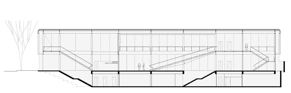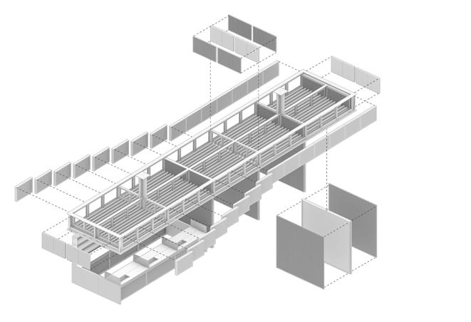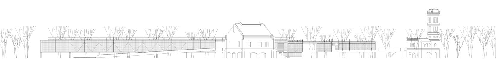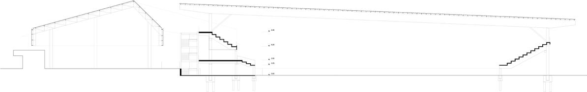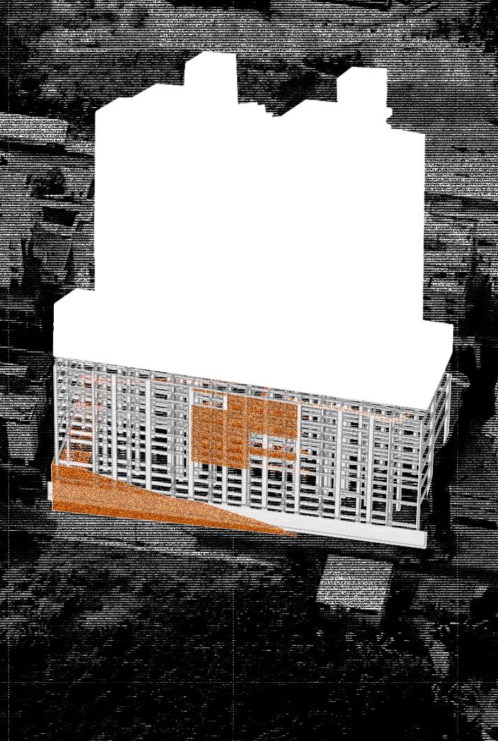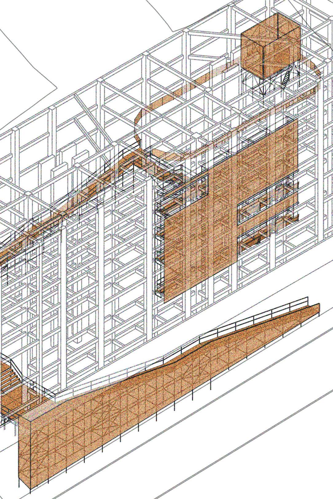 No sentido transversal, a estrutura em concreto armado moldado in loco que receberá as atividades prin cipais do novo programa se afasta, através de eixo de pilares, em 1,50 m do galpão a ser preservado. Duas torres alinhadas ao limite lateral do lote aglutinam as áreas molhadas e as circulações verticais secundárias, garantindo flexibilidade aos layouts de exposição e outras atividades culturais. Situando-se na faixa rema nescente entre o galpão e a nova estrutura, as circulações verticais principais e seus patamares são sustenta dos por estrutura metálica que se engasta na estrutura em concreto armado a partir do segundo pavimento, propondo um percurso que se vale da interface das construções de diferentes épocas. O segundo pavimento é todo envelopado por telhas onduladas de policarbonato translúcido, fixadas em quadros metálicos, que por sua vez se conectam na estrutura metálica engastada. Isso proporciona leveza ao novo volume quando em contato com o antigo galpão, a partir do exterior; e uma reinterpretação visual turva e embaçada das edificações históricas preservadas, a partir do interior.