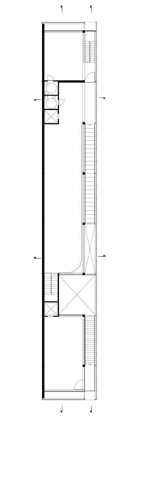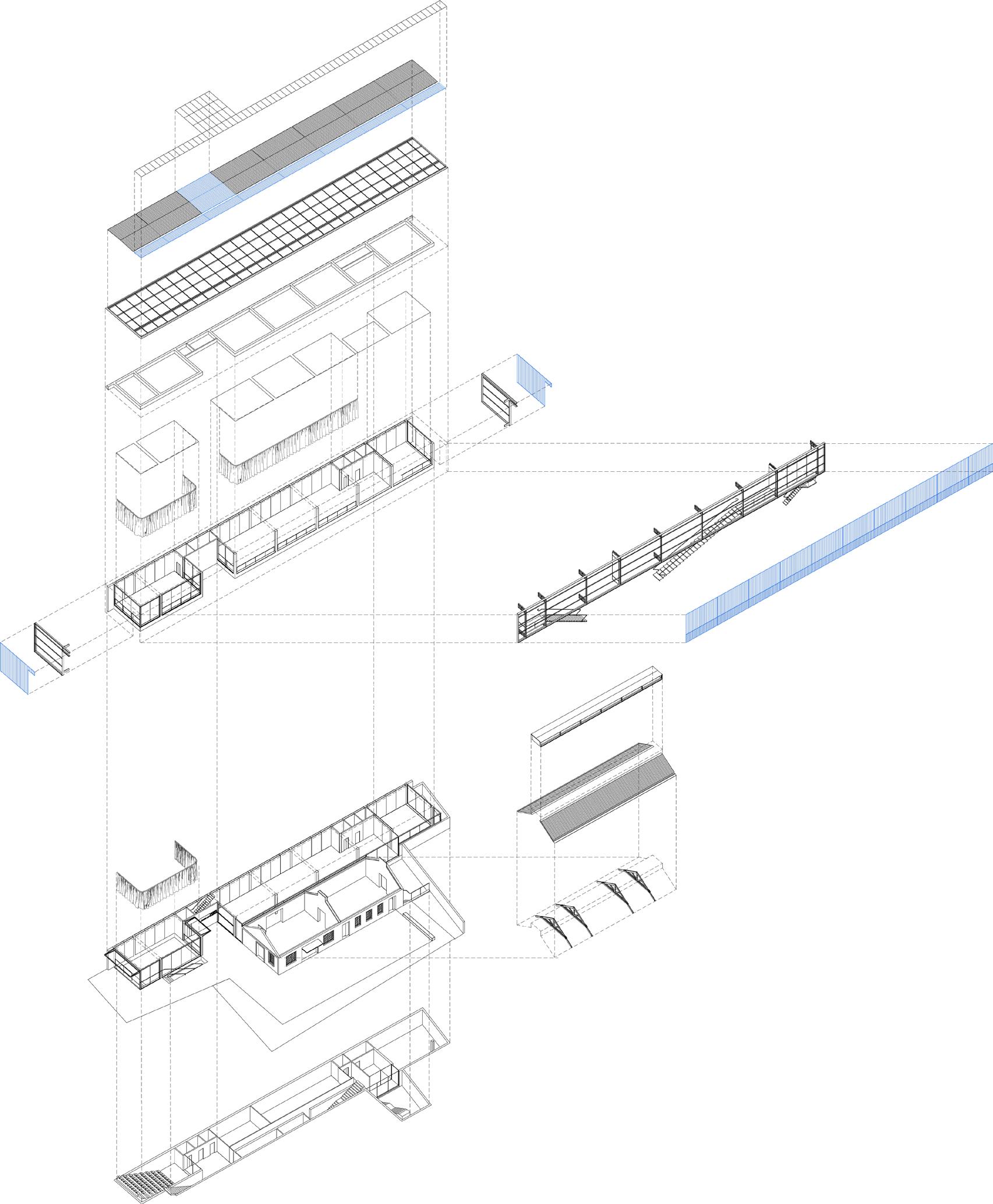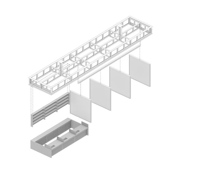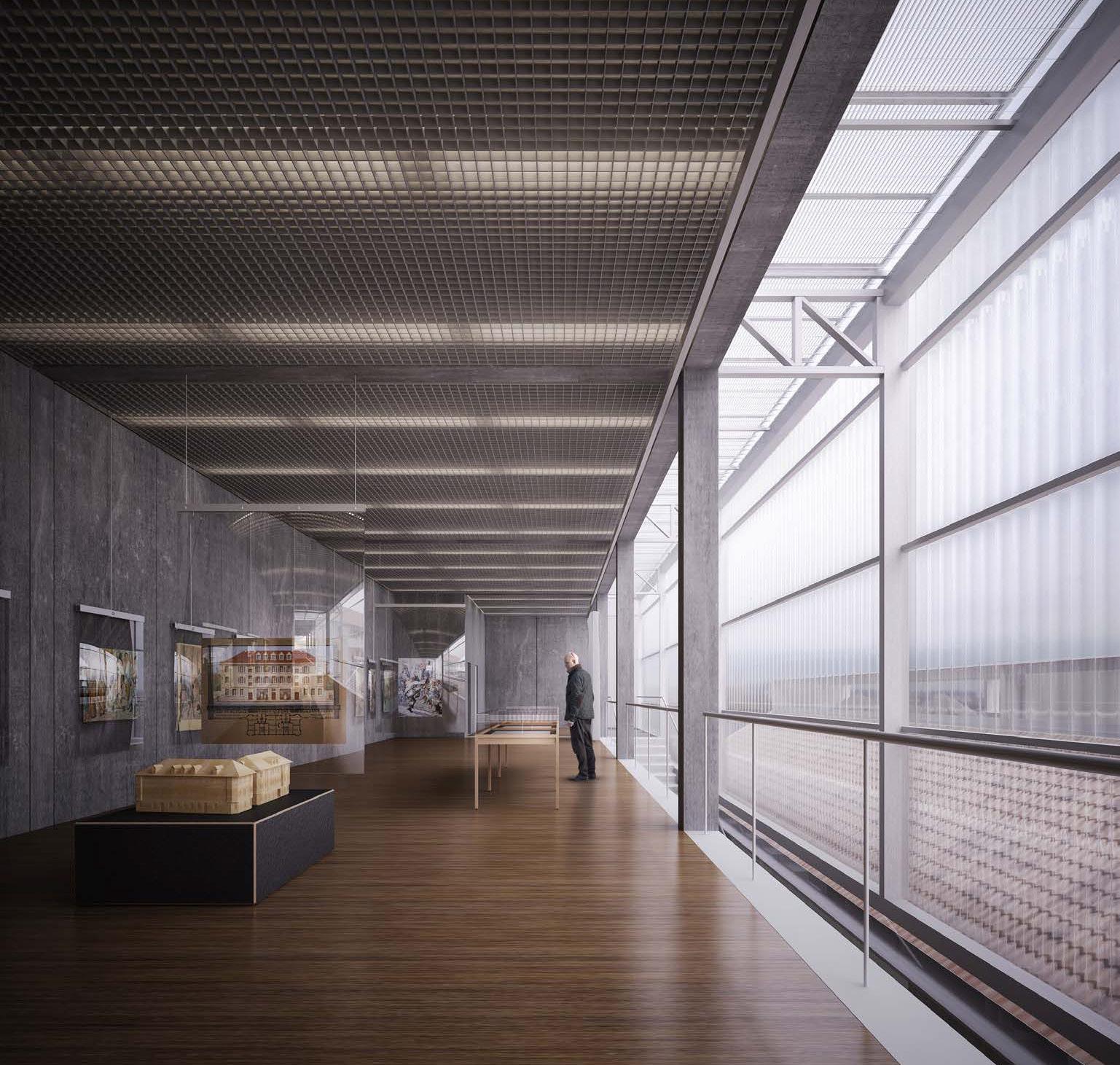 No sentido transversal, a estrutura em concreto armado moldado in loco que receberá as atividades prin cipais do novo programa se afasta, através de eixo de pilares, em 1,50 m do galpão a ser preservado. Duas torres alinhadas ao limite lateral do lote aglutinam as áreas molhadas e as circulações verticais secundárias, garantindo flexibilidade aos layouts de exposição e outras atividades culturais. Situando-se na faixa rema nescente entre o galpão e a nova estrutura, as circulações verticais principais e seus patamares são sustenta dos por estrutura metálica que se engasta na estrutura em concreto armado a partir do segundo pavimento, propondo um percurso que se vale da interface das construções de diferentes épocas. O segundo pavimento é todo envelopado por telhas onduladas de policarbonato translúcido, fixadas em quadros metálicos, que por sua vez se conectam na estrutura metálica engastada. Isso proporciona leveza ao novo volume quando em contato com o antigo galpão, a partir do exterior; e uma reinterpretação visual turva e embaçada das edificações históricas preservadas, a partir do interior.