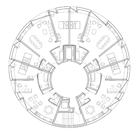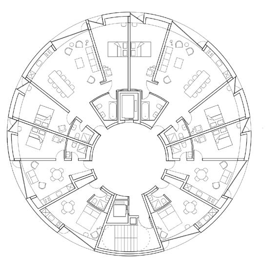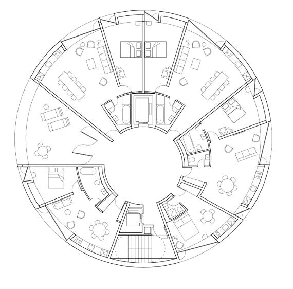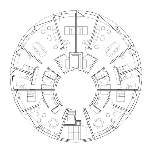 O formato circular do edifício tipo Tower proporciona um melhor desempenho aerodinâmico, diminuindo o coeficiente de arrasto quando comparado a uma edificação prismática tradicional. O sistema de contraventamento é composto por núcleos rígidos de concreto nas circulações verticais, conectados por vigas radiais a uma casca externa composta por pilares de MLC e painéis CLT curvos. Em relação à segurança estrutural contra incêndios, lajes mistas de CLT-concreto criam barreiras de propagação entre os pavimentos.