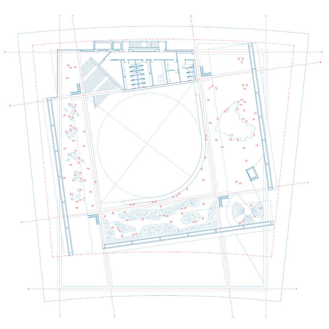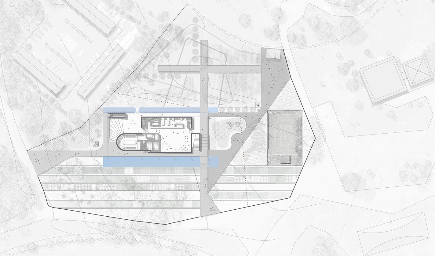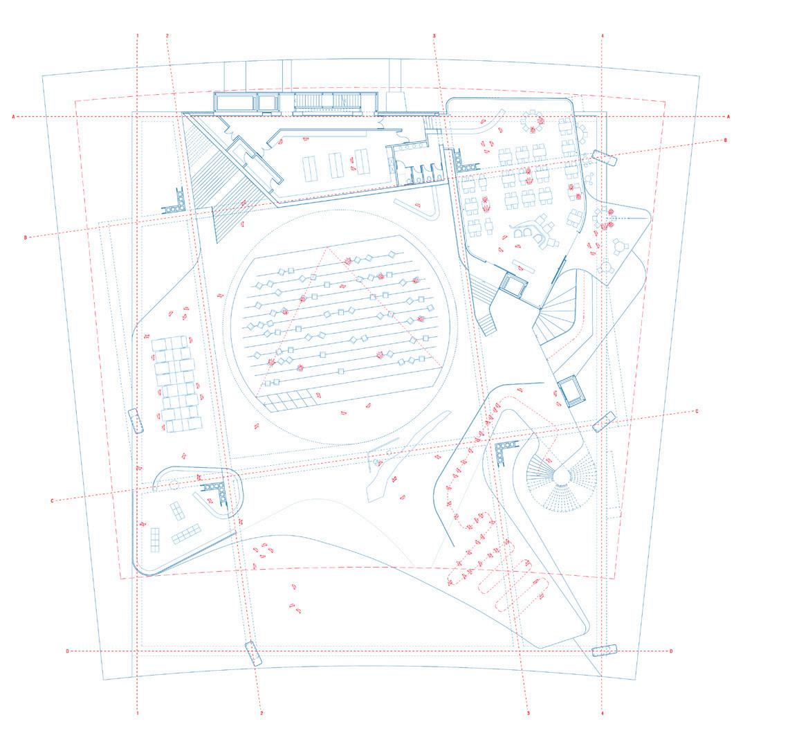 térreo: o acesso noroeste prevê uma larga escadaria em leque que se desenvolve ao redor do salão de reuniões principal. as portas de acesso à sudeste alinham-se com as portas do acesso à noroeste, de modo que o espaço de exposições principal funciona como uma adjacência ao percurso proposto. situadas à oeste e ao longo deste principal eixo circulatório, as áreas administrativas. o espaço de exposições temporárias conta com pé-direito alto e abundante iluminação natural. o salão de reuniões conta com om iluminação e ventilação natural, pé-direito múltiplo e dispõe de depósito, salas de apoio e infraestrutura multimídia.