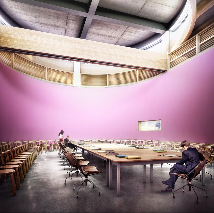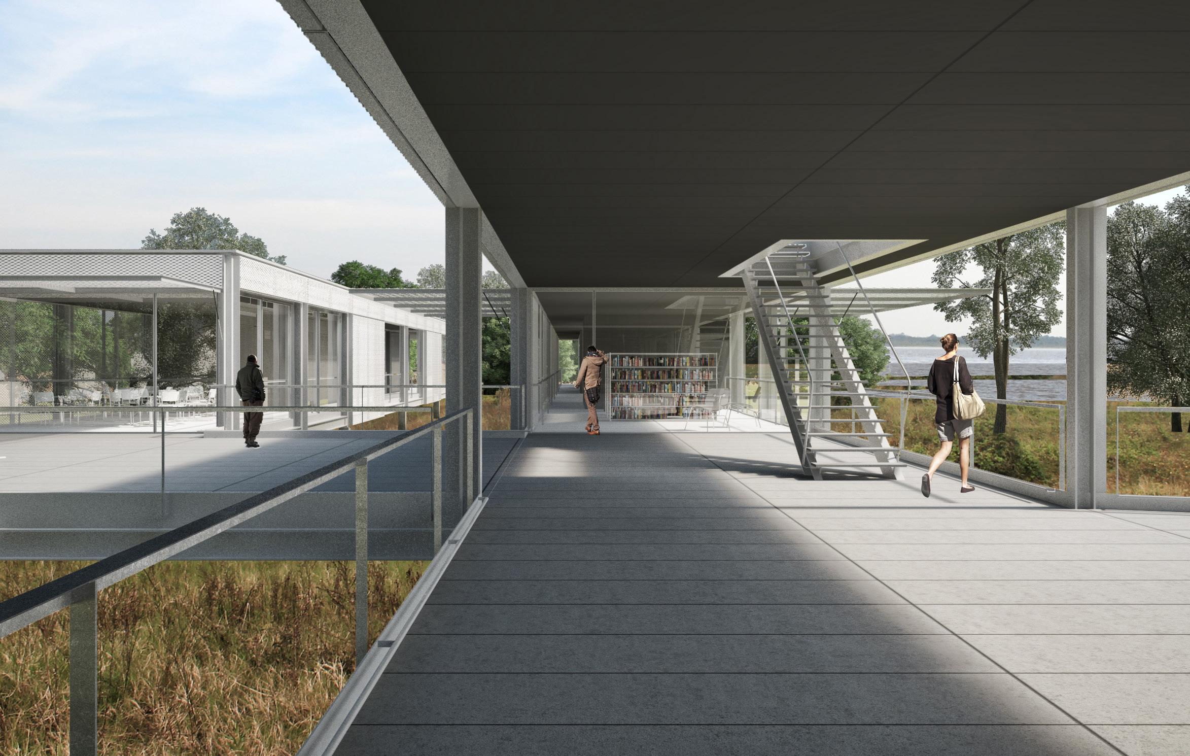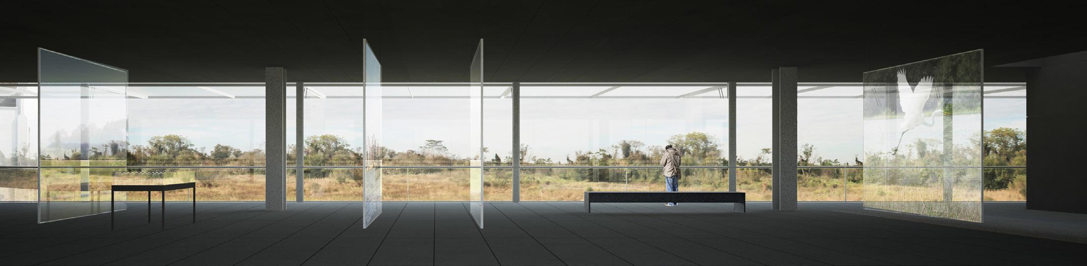 térreo: o acesso noroeste prevê uma larga escadaria em leque que se desenvolve ao redor do salão de reuniões principal. as portas de acesso à sudeste alinham-se com as portas do acesso à noroeste, de modo que o espaço de exposições principal funciona como uma adjacência ao percurso proposto. situadas à oeste e ao longo deste principal eixo circulatório, as áreas administrativas. o espaço de exposições temporárias conta com pé-direito alto e abundante iluminação natural. o salão de reuniões conta com om iluminação e ventilação natural, pé-direito múltiplo e dispõe de depósito, salas de apoio e infraestrutura multimídia.
