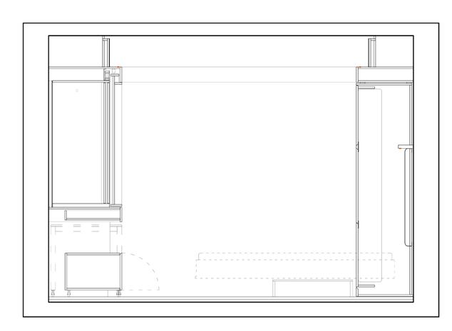 telha sanduíche, e=5cm forro tipo colmeia, 5x5cm trilho cortina de correr concreto armado in loco perfil tubular metálico, 15x15cm cortina tipo rolo telha de policarbonato translúcido grelha móvel para proteção solar luminária piso em madeira tábuas telha francesa existente tesoura madeira existente perfil tubular metálico, 7,5x15cm chapa metálica zinco isolamento lã de rocha esquadria alumínio gesso acartonado, e=1,5cm parede em alvenaria existente piso cimento queimado piso paralelepípedo