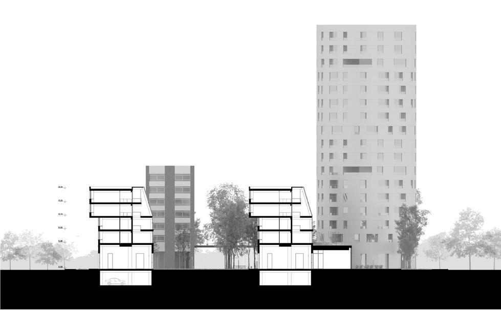 O projeto procura encontrar equilíbrio e beleza no tecido da cidade. Acreditamos na importância de ter ruas ricamente ativadas no nível do pedestre e na alegria de reuniões inesperadas e qualquer outro tipo de interação social urbana - todavia, não buscamos essas qualidades em qualquer tipo de emulação do tecido da cidade medieval, mas em quarteirões da cidade relativamente pequenos, porosos e entrelaçados. O projeto explora calçadas periféricas e o interior dos blocos - proporcionando um ambiente urbano, rápido e silencioso, com mais alternativas de caminhos bucólicos. Uma construção baixa e linear conecta o os edifícios residenciais, ajudando a moldar espaços legíveis dentro do bloco, enquanto fornece espaço para atividades comerciais e públicas que são complementos essenciais para as residências. Acima dela, os moradores encontram os abundantes terraços condominiais para banhos de sol, plantio e reuniões amigáveis.