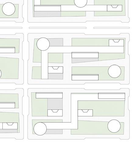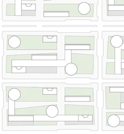diferentes configurações de quarteirões com variações na disposição das tipologias habitacionais e da barra térreo de uso público