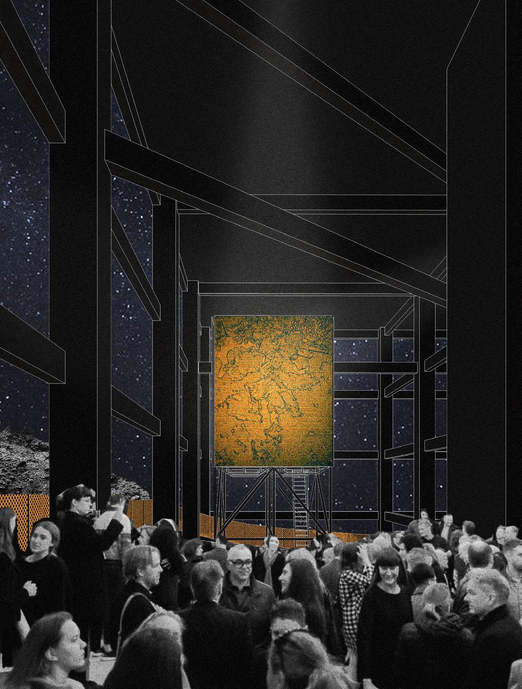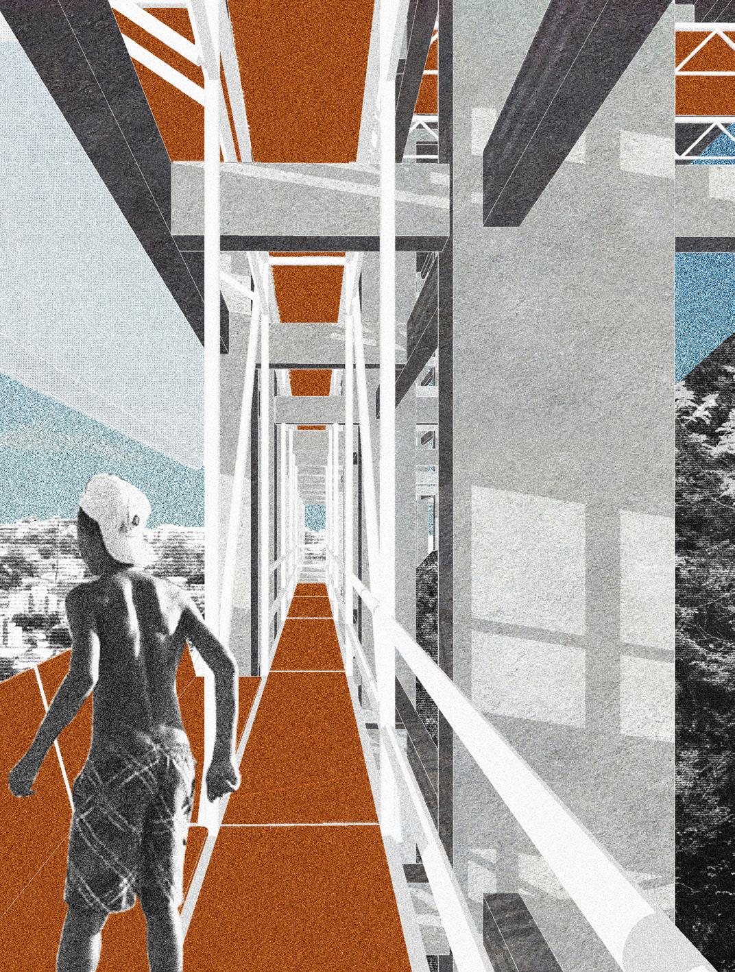 Dentre a gama de palafitas da região que foram disponibilizadas pela organização do concurso, decidimos intervir na que foi denominada palafita-gigante I, sob o edifício localizado na rua Maria Heilbuth Surette, n. 1193, em função da acessibilidade facilitada a pedestres e à consequente potencialidade de experiências que a retícula permite em seu interior. A dimensão monumental do conjunto e a variabilidade de contrastes possíveis na criação de estares e percursos penetráveis foi motivo da elaboração estéticoarquitetônica aqui presente. A articulação entre a ortogonalidade das fundações estruturais perenes em concreto armado e a organicidade do terreno de agudo aclive se dá no gesto da adição de estruturas auxiliares efêmeras de manutenção e construção. Deslocados, aqui, de seu lugar cotidiano, o sistema de andaimes presta-se enquanto termo significante da linguagem da construção-obra para a fruição da projeção enquanto projeto, ao provocar a expansão de seu significado na vivência do momento presente como potencialidade para um devir futuro em uma sensibilização do ser cidadão - observadorparticipante - co-construtor.