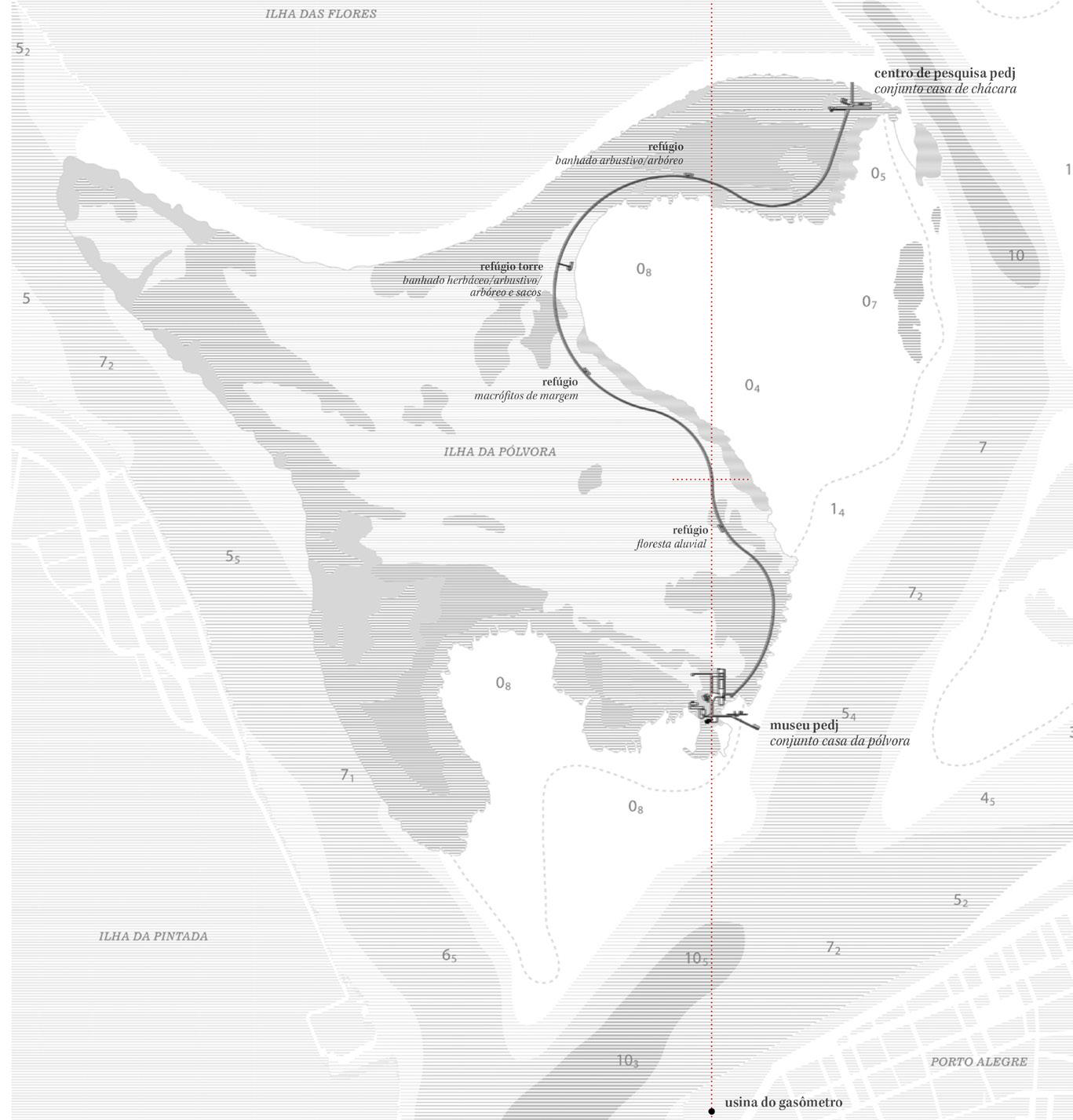 A intervenção na Ilha da Casa da Pólvora traz consigo a possibilidade de criar um equipamento de escala metropolitana, visando estabelecer uma interface apropriada entre a urbe porto alegrense e o Parque Estadual Delta do Jacuí. Para tanto, considera-se a inserção de equipamentos com porte adequado à significância da unidade de conservação na cidade e na paisagem. Visando a consolidação do local como espaço público efetivo, a escolha do programa e a escala são decisivas, devendo atingir públicos variados. O projeto leva em conta as melhorias realizadas através do programa Pró-Guaíba, porém interpreta que para a ativação plena da área, é necessária a presença de estrutura capaz de abrigar diferentes eventos, sejam eles vinculados diretamente ao tema do ecossistema e da história local, sejam eles de assuntos diversos. Valendo-se das edificações históricas da ilha, criam-se dois polos principais de atividades: situado ao sul e vinculado ao Paiol de Pólvora e à Casa da Guarda, estabelece-se o Museu do PEDJ, voltado ao turismo ecológico, cultural e ao lazer; situado ao norte e vinculado à Casa da Chácara se estabelece o Centro de Pesquisa PEDJ. É a intenção de conjugar a memória do lugar com as demandas de sustentabilidade atuais. Um diálogo entre passado e presente no qual é respeitada a vocação do local.