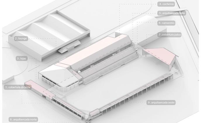 Atendendo aos principais desejos da associação - a construção de uma cobertura de vão suficientemente grande para cobrir a principal pista de provas por inteiro; e a construção de camarotes, para geração de renda -, o projeto é concebido de modo que possa ser executado também em etapas espaçadas no tempo, fazendo uso de elementos construtivos modulares e faseando a obra com a construção de partes que podem funcionar com certa autonomia enquanto o conjunto ainda está inconcluso.