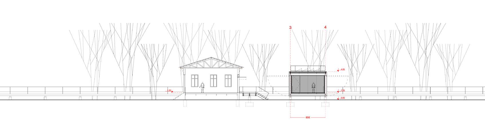 04-05. adequações à intervenção proposta: preservação da laje, palafitas e fundações em concreto armado da unidade de apoio, assim como da praça elevada. remoção das trilhas em madeira, em péssimo estado de conservação, e das paredes de alvenaria da unidade de apoio, para mudança de programa.