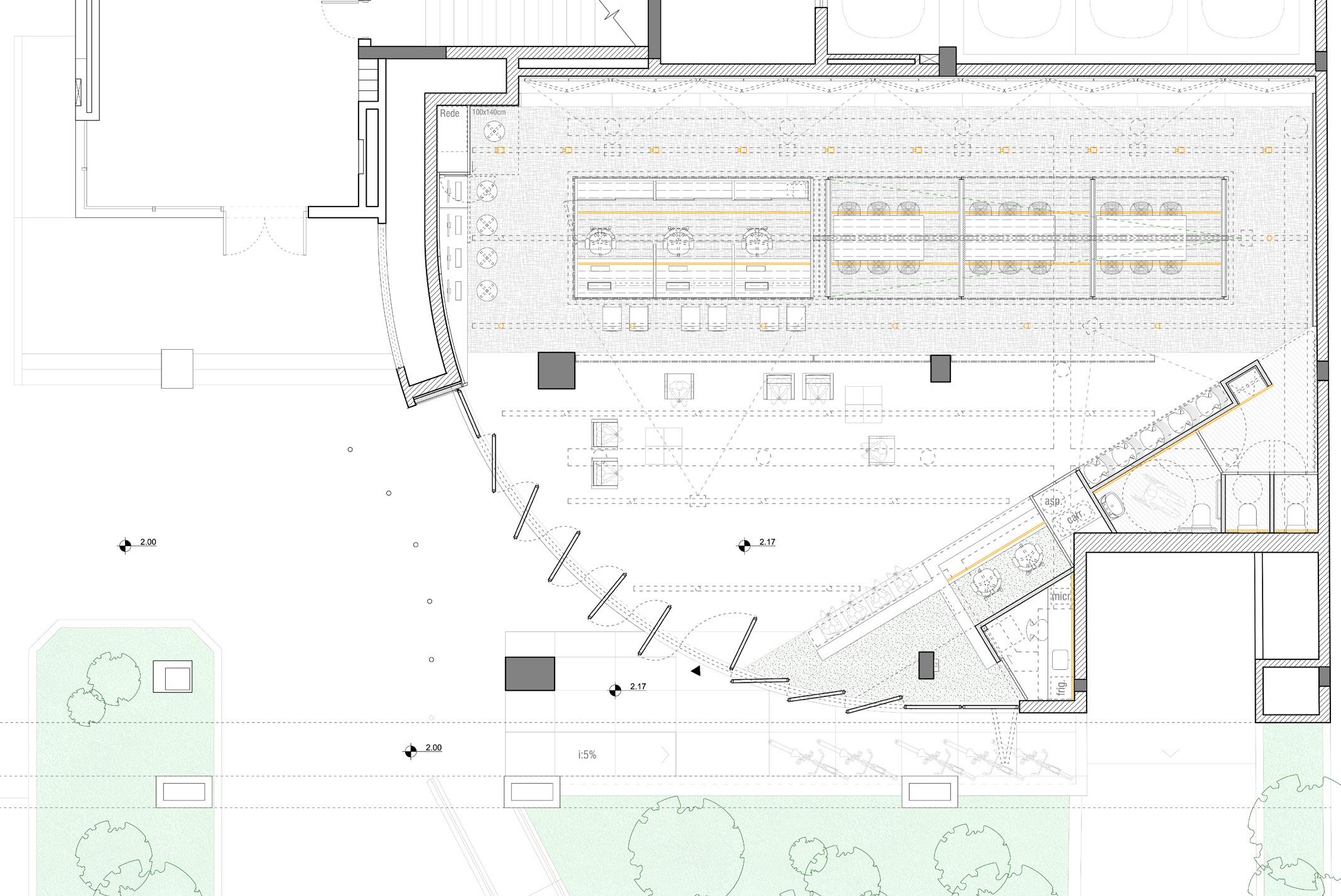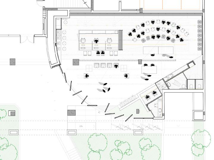 a grande marquise de entrada somada à permeabilidade do térreo permite fácil manejo das filas sem perturbar o acesso às áreas de alimentação ou aos eventos temporários.