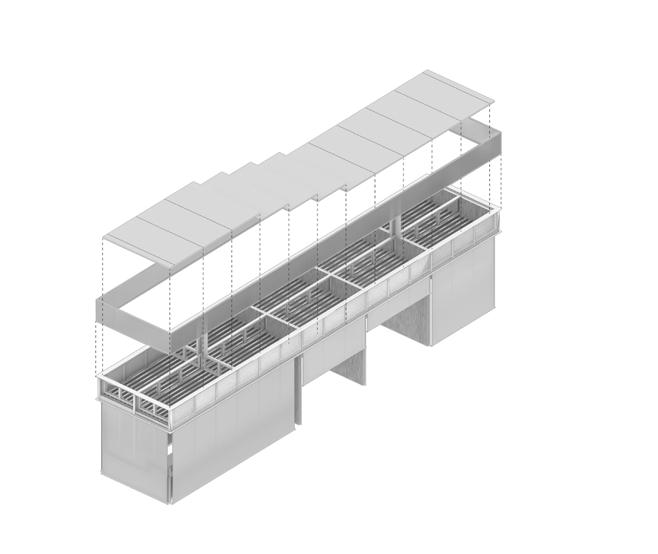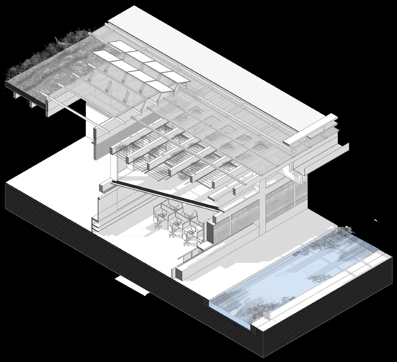 cobertura: a cobertura visitável permite conhecer as soluções de captação de água da chuva e de energia solar, além de familiarizar o visitante com outras soluções ecológicas de construção como iluminação zenital e coberturas verdes – aqui aproveitadas como hortas educativas. um amplo deck flutuante configurase como um espaço aberto público singular, que oferece longas visuais sobre o parque enquanto se conecta ao passeio contínuo disponível ao visitante. acima do salão principal de reuniões e levemente descolado do plano de cobertura, apresenta-se um característico volume cilíndrico onde se encontram os reservatórios superiores e seus maquinários.