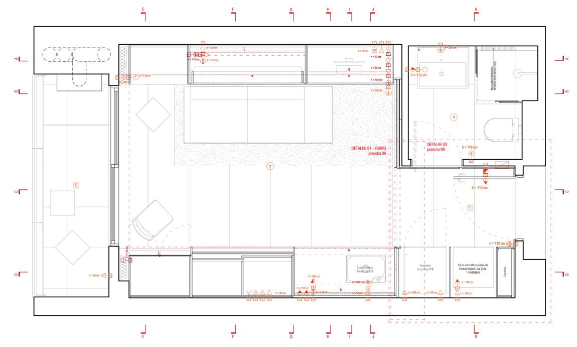 telha sanduíche, e=5cm forro tipo colmeia, 5x5cm trilho cortina de correr concreto armado in loco perfil tubular metálico, 15x15cm cortina tipo rolo telha de policarbonato translúcido grelha móvel para proteção solar luminária piso em madeira tábuas telha francesa existente tesoura madeira existente perfil tubular metálico, 7,5x15cm chapa metálica zinco isolamento lã de rocha esquadria alumínio gesso acartonado, e=1,5cm parede em alvenaria existente piso cimento queimado piso paralelepípedo