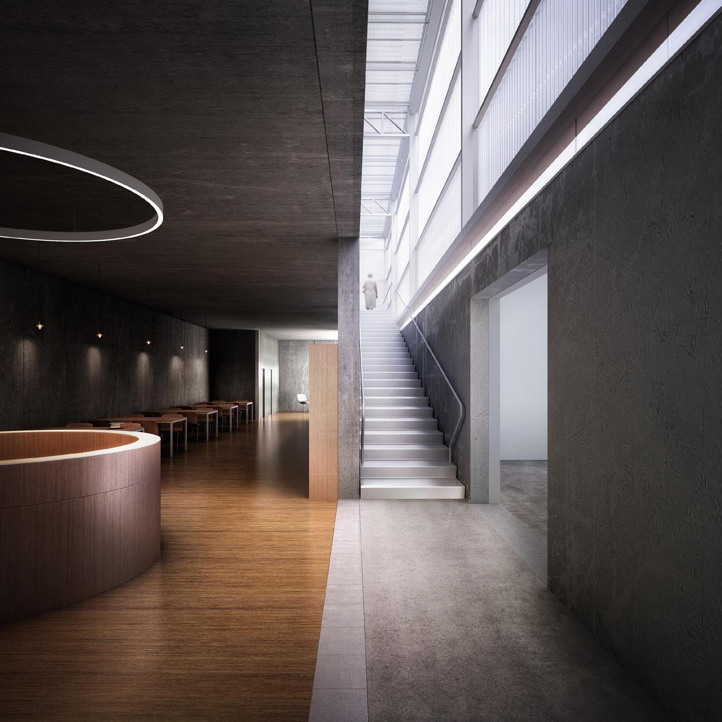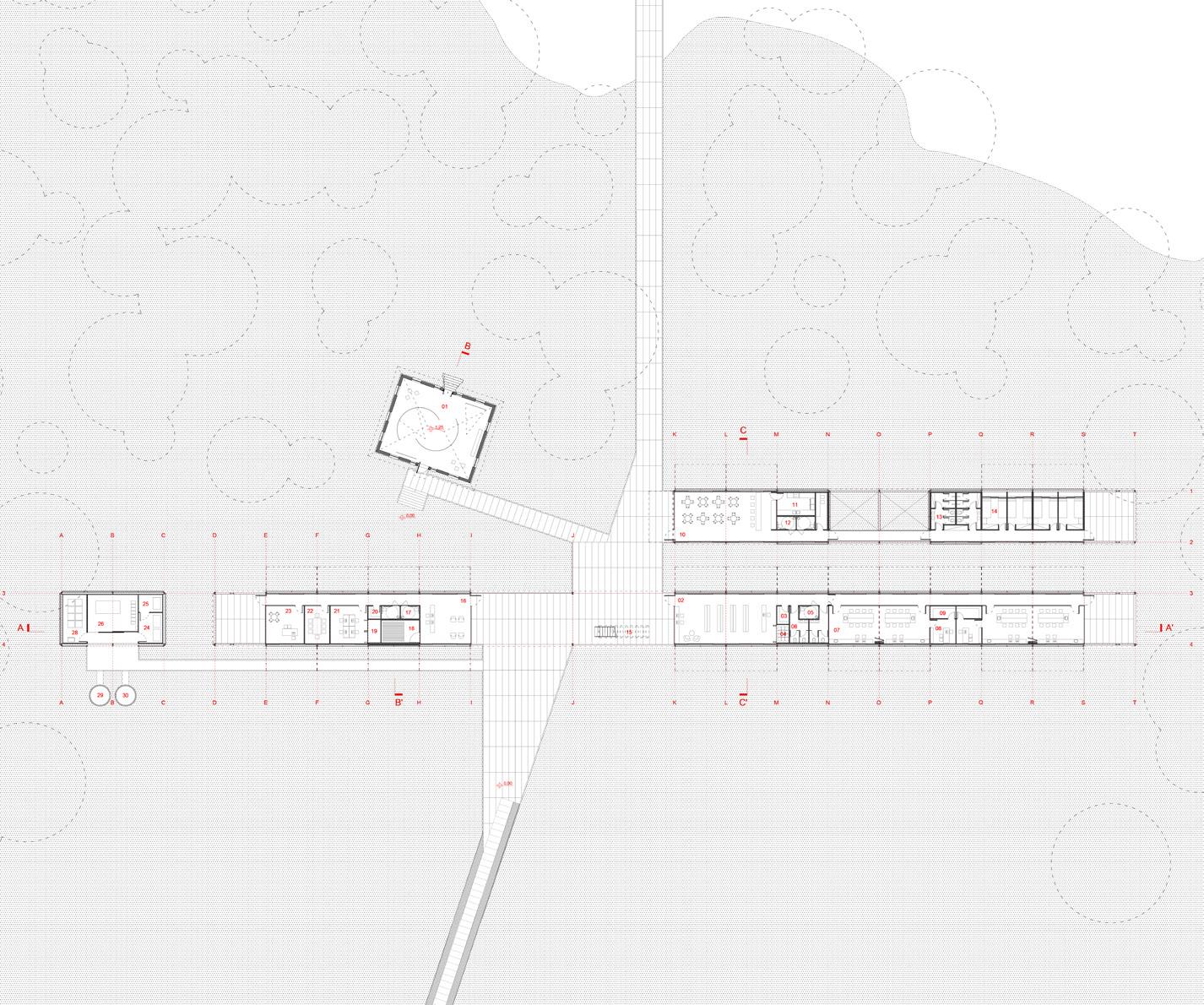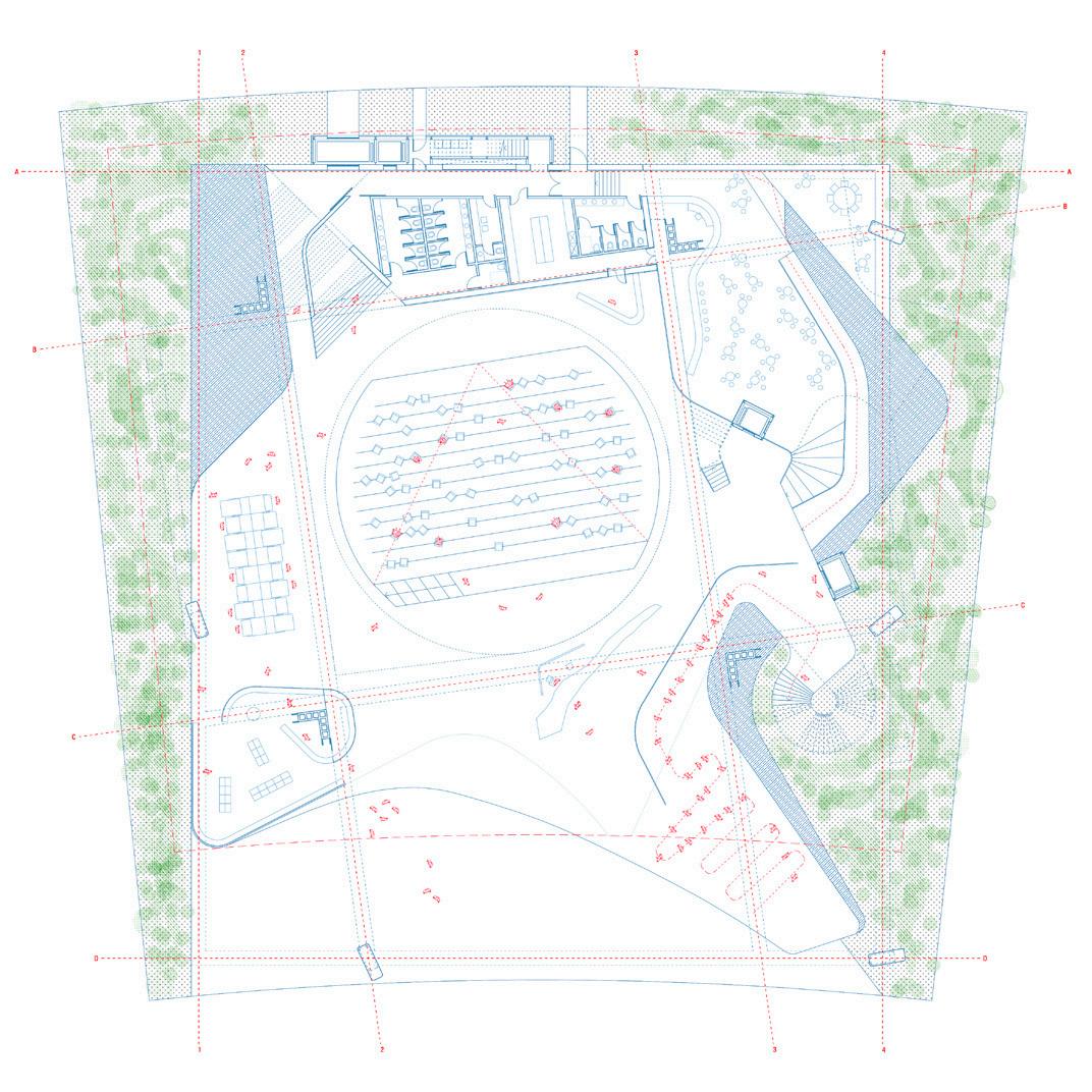 térreo: o acesso noroeste prevê uma larga escadaria em leque que se desenvolve ao redor do salão de reuniões principal. as portas de acesso à sudeste alinham-se com as portas do acesso à noroeste, de modo que o espaço de exposições principal funciona como uma adjacência ao percurso proposto. situadas à oeste e ao longo deste principal eixo circulatório, as áreas administrativas. o espaço de exposições temporárias conta com pé-direito alto e abundante iluminação natural. o salão de reuniões conta com om iluminação e ventilação natural, pé-direito múltiplo e dispõe de depósito, salas de apoio e infraestrutura multimídia.