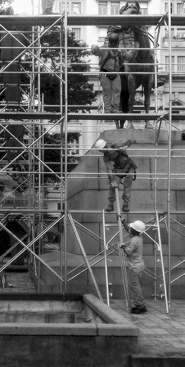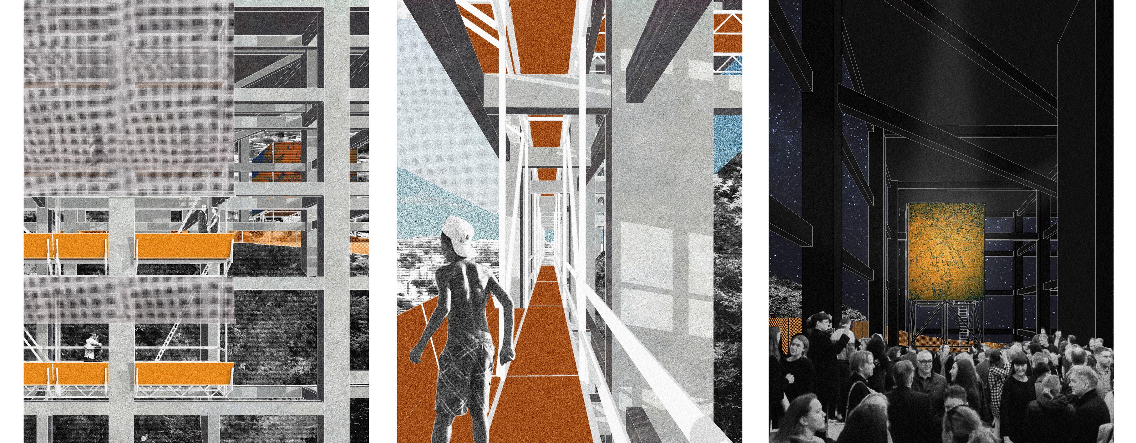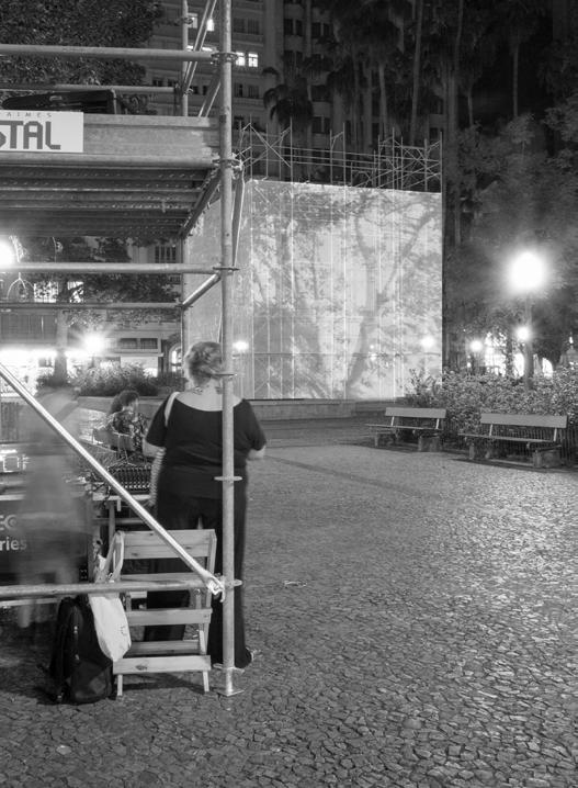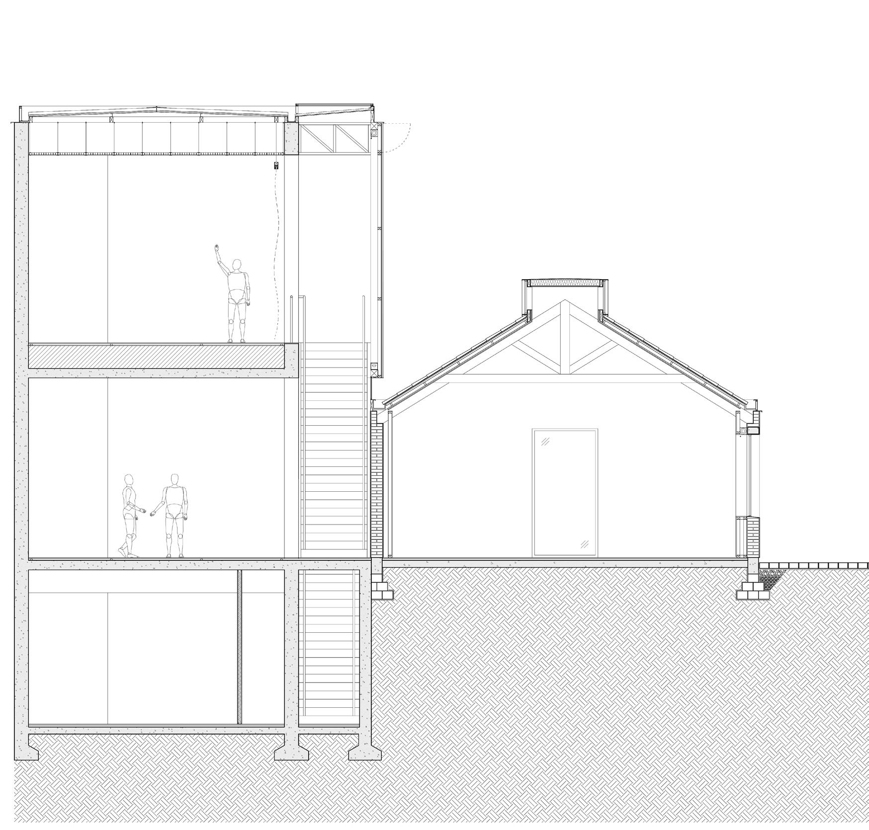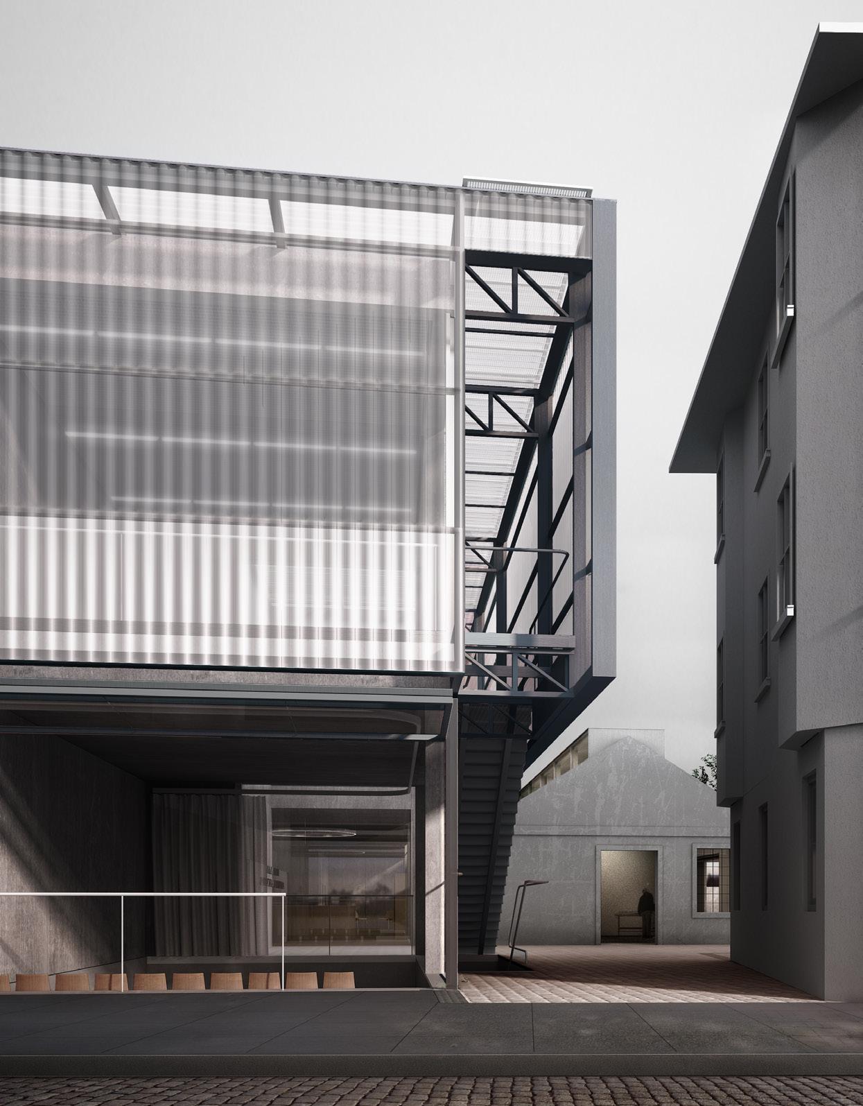 No sentido transversal, a estrutura em concreto armado moldado in loco que receberá as atividades prin cipais do novo programa se afasta, através de eixo de pilares, em 1,50 m do galpão a ser preservado. Duas torres alinhadas ao limite lateral do lote aglutinam as áreas molhadas e as circulações verticais secundárias, garantindo flexibilidade aos layouts de exposição e outras atividades culturais. Situando-se na faixa rema nescente entre o galpão e a nova estrutura, as circulações verticais principais e seus patamares são sustenta dos por estrutura metálica que se engasta na estrutura em concreto armado a partir do segundo pavimento, propondo um percurso que se vale da interface das construções de diferentes épocas. O segundo pavimento é todo envelopado por telhas onduladas de policarbonato translúcido, fixadas em quadros metálicos, que por sua vez se conectam na estrutura metálica engastada. Isso proporciona leveza ao novo volume quando em contato com o antigo galpão, a partir do exterior; e uma reinterpretação visual turva e embaçada das edificações históricas preservadas, a partir do interior.