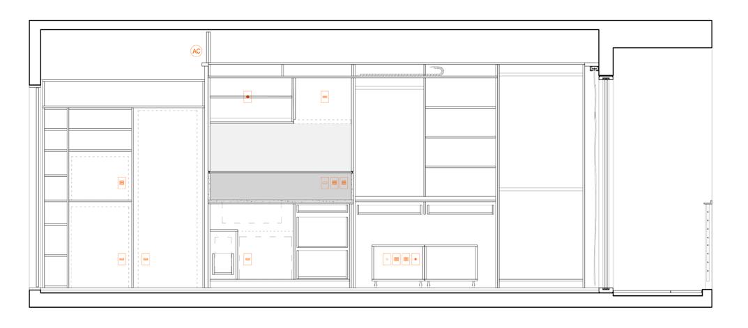 o bloco de recepção e serviços é um bloco único que arremata a irregularidade da planta original e convida o visitante a adentrar o espaço ao mesmo tempo que acomoda grande parte do programa de necessidades. na cota mais alta, rente à laje, situam-se os dutos do aparelho: os de retorno resguardados por uma veneziana metálica que arremata o bloco por inteiro, e o de insuflamento passando por cima da mesma.