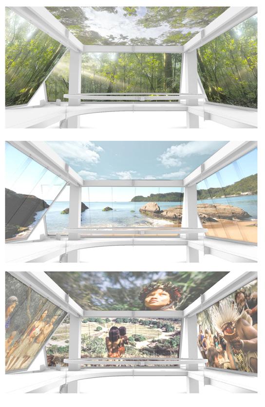 Ao final, caso o auditório não esteja em uso, o visitante pode sentar-se confortavelmente na área central para acompanhar por mais alguns minutos as transformações que os vídeos imersivos causam no pavilhão, aprendendo mais sobre a cultura e a natureza do Brasil.