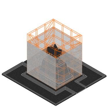 atividades de uso comum do complexo, enquanto as atividades de memorial do arquiteto se concentrarão no volume a ser inserido no terreno vizinho. O galpão em alvenaria, que hoje abriga as principais atividades coletivas em área interna, será mantido e adaptado aos fluxos gerados pela nova inserção, tanto por economia de recursos, como por afeição à memória recente. Nele ocorrerão as exposições itinerantes, conservando as características de um espaço flexível que poderá tirar proveito do fluxo e da escala entre o pátio interno e a edificação do memorial.