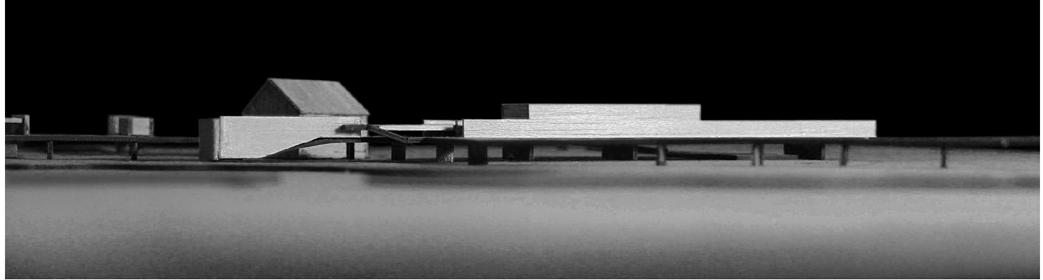 fotos da maquete de estudos da intervenção no sul da ilha e da torre da casa de guarda vista a partir da ilha da pintada