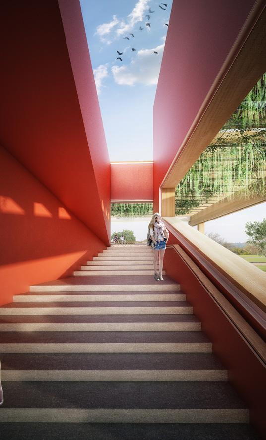 O pavilhão se apresenta para os visitantes como uma enorme marquise que pode ser acessada de qualquer direção que se venha e a partir da qual já se pode antever, através da permeabilidade do perímetro, o grande espaço central de pé-direito múltiplo ao redor do qual se organiza o projeto. Este espaço central monumentalizado onde as pessoas se reúnem possui precedentes em diversas culturas que compõem o Brasil, desde as aldeias indígenas até os espaços religiosos europeus, enquanto o círculo possui uma potência imagética que remete à união e à coletividade. A materialização do pavilhão através de superfícies translúcidas e de uma geometria de matriz cartesiana permite também que visitantes de culturas árabes percebam que há ali uma sutil homenagem à sua cultura. Assim, enfatizamos que a atitude do Brasil é amistosa e que sua mensagem é universal. Ainda que o pavilhão seja bastante aberto a partir do ponto de vista do observador, ele protege-se inteiramente do forte sol da região e aproveita sua forma para eliminar naturalmente o ar quente, substituindo-o continuamente através de uma estratégia passiva de controle térmico conhecida como efeito chaminé. Acreditamos, por fim, que as características plásticas do projeto possam ser bem vindas na paisagem construída da EXPO 2020, tornando o pavilhão do Brasil visível e atraente de uma maneira simples e contundente.