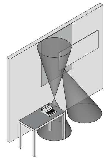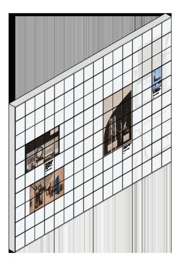 “Showcase system of three shaped and colored sliding and folding crystals, for different advertising perspectives, with shop backgrounds.”