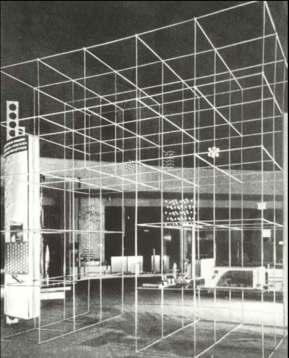 The second concept worth to me mentioned is the use of hyperbolic paraboloids made with threads for creating translucent volumes for a Olivetti storefront in Galleria Vittorio Emanuele, Milano in1938. The design was executed by Leonardo Sinisgalli & Giovanni Pintori. Experiments like this one were performed in the sculpture lab of the Bauhaus as early as 1926.