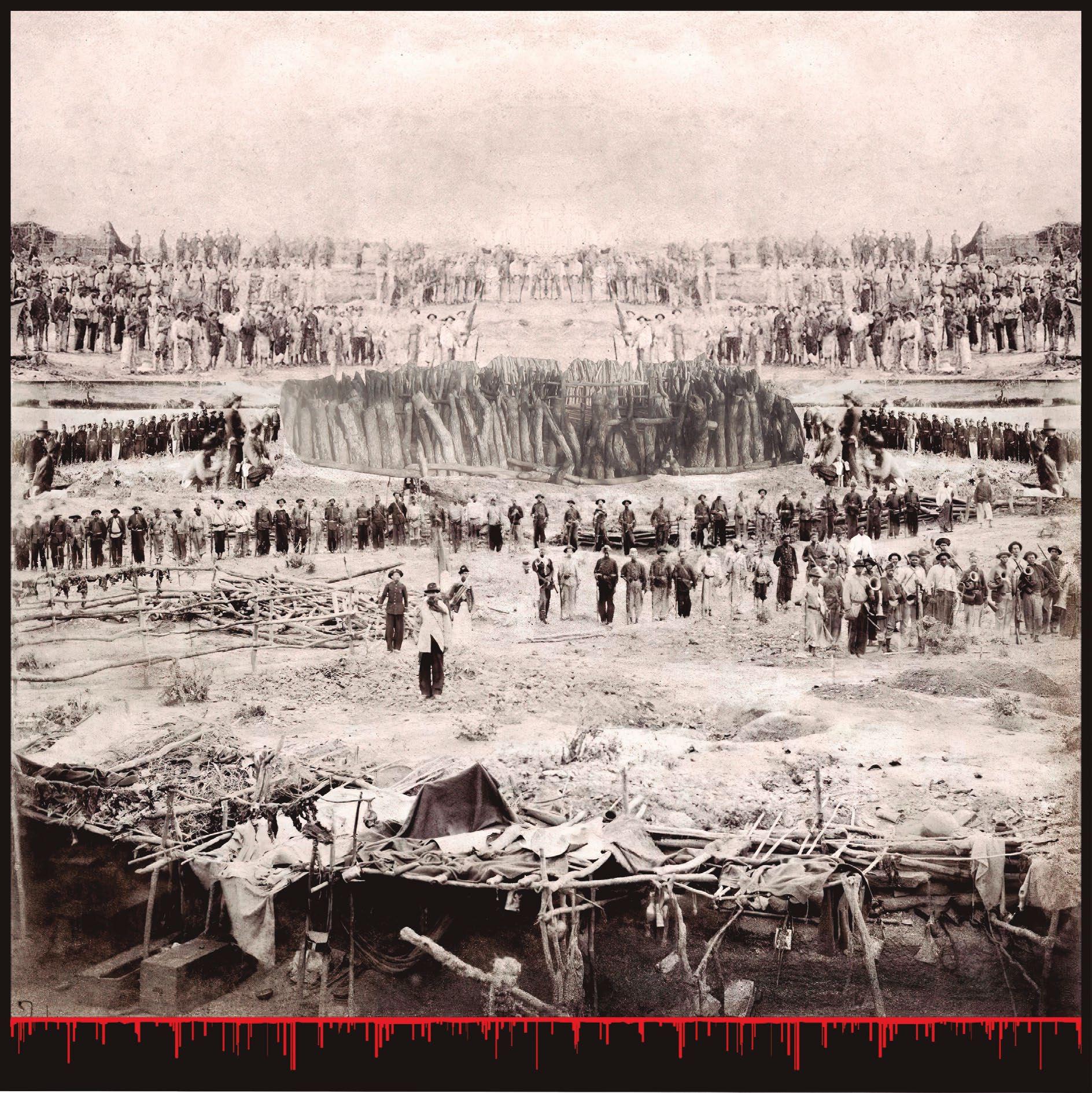 imagens de terra arrasada, escombros da cidade sobre mapas do Estado da Bahia, paliçadas, muros e limites da cidade destruída, a igreja demolida, homens, mulheres e crianças mortos e cenas que sugerem ataques surgidas das narrativas de Euclides: “Não lhes bastavam seis mil Mannilinchers e seis mil sabres, e o calcanhar de doze mil coturnos... sob a impassibilidade de céus tranquilos e claros — a queda de um ideal ardente, a extinção absoluta de uma crença consoladora e forte.” Isto tudo contra homens armados de peixeiras, paus e pedras. “Caiu o Arraial a 5. No dia 6 acabaram de o destruir desmanchando-lhe as casas. 5.200, cuidadosamente contadas”.