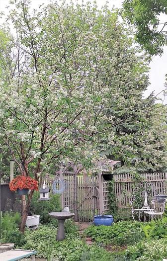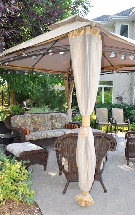 Doyle and Michele Piwniuk have created the perfect dining-sitting area, complete with a kitchen preparation and storage area, a pizza oven, and a fireplace for cool evenings. They have surrounded their garden courtyard with densely planted trees to create seclusion from their nearby neighbours. This also prevents wind from spoiling the fun, while allowing air to circulate. A threeseason greenhouse for potting completes the plan.