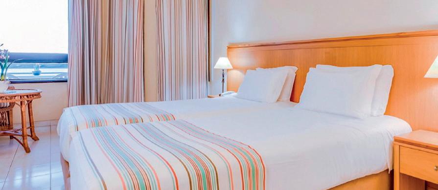 • Indkvartering på Hotel Auramar Beach Resort Sol i dobbeltværelse eller på enkeltværelse, hvis det er bestilt. Der er balkon/altan samt have- og havudsigt ved værelserne.