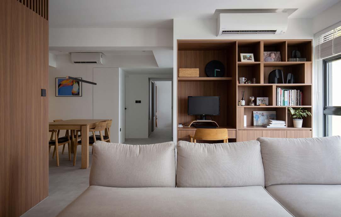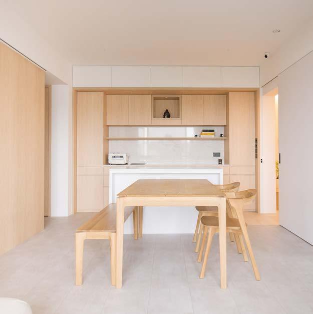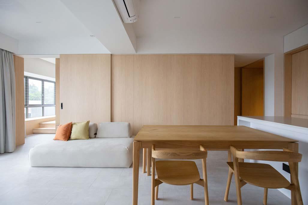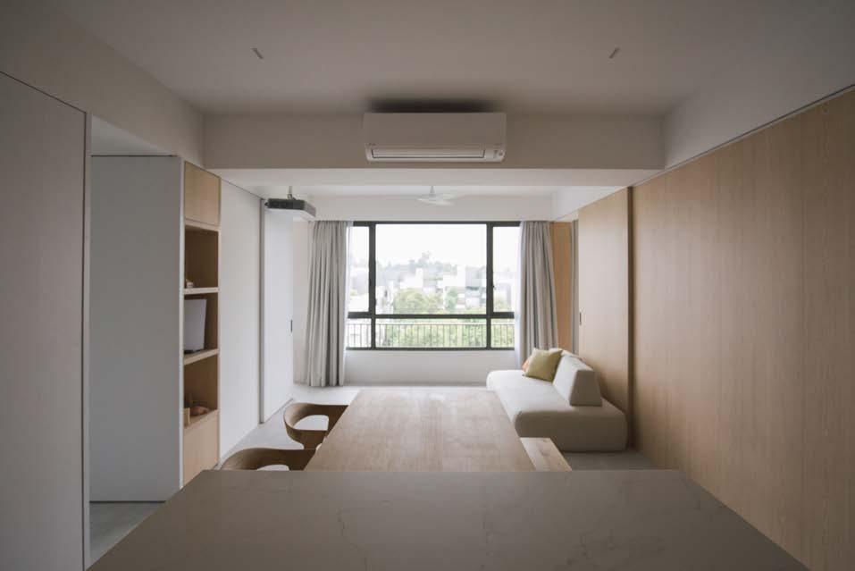 使用了温和且中性的建材来混淆这狭小空间的边界线。 沉淀室内色泽以使得户外绿茵景色更为凸显,这也 是为了迎合热爱大自然与花草树木的客户。 模糊的边界线间接在视觉上达到了 开放式的空间布局规划。
