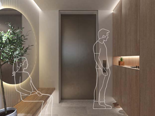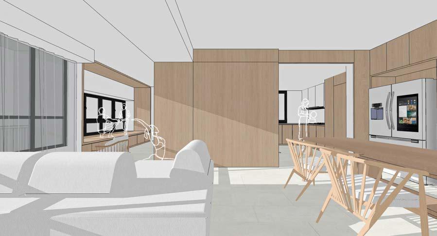 Exploration in door can be wall and projector screen, transformable and shows the flexibility of the space. The openable wall increase the activities space for a compact condominium space.