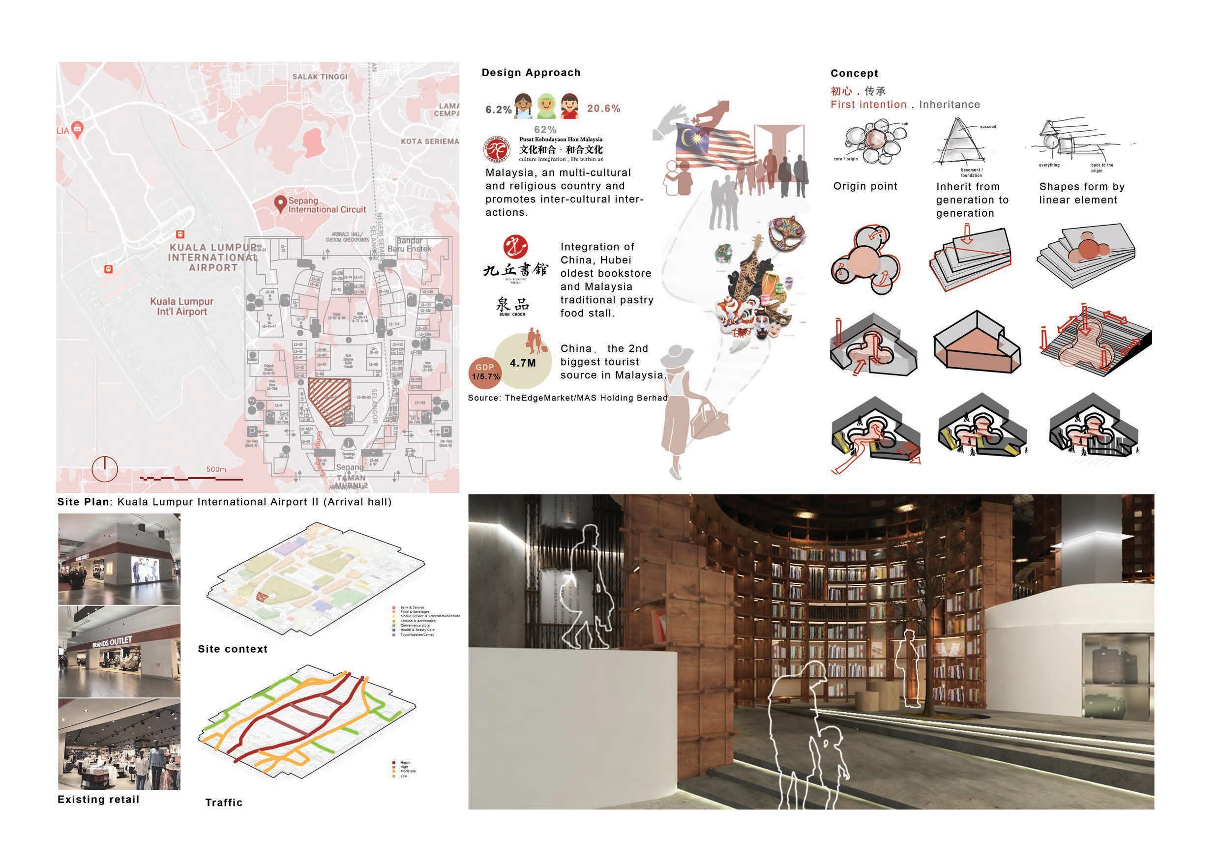 原店铺 交通 地点周遭 设计想法 马来西亚,一个多元种族多元文化的国家并提倡跨文化的互动。 整合了中国湖北 最古老的书局及 马来西亚传统的 糕点食物摊。 中国,马来西 亚第二大旅游 资源。 原点 每一代的传承 由各种线组成的形状