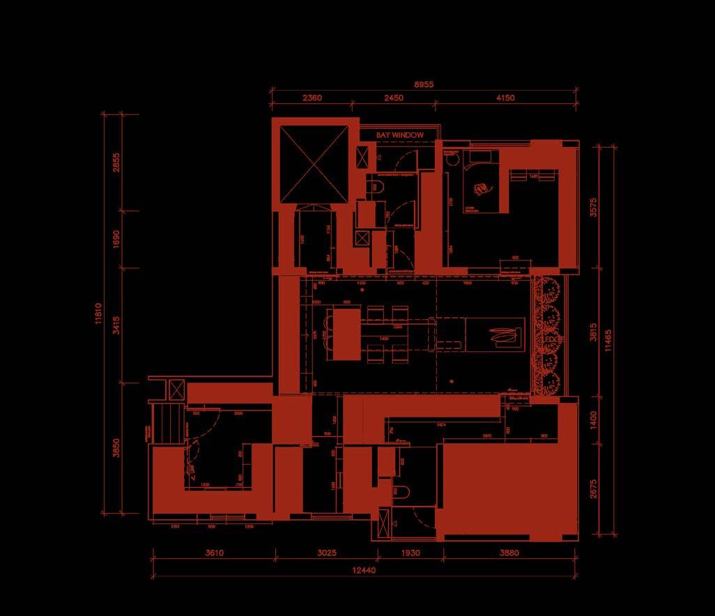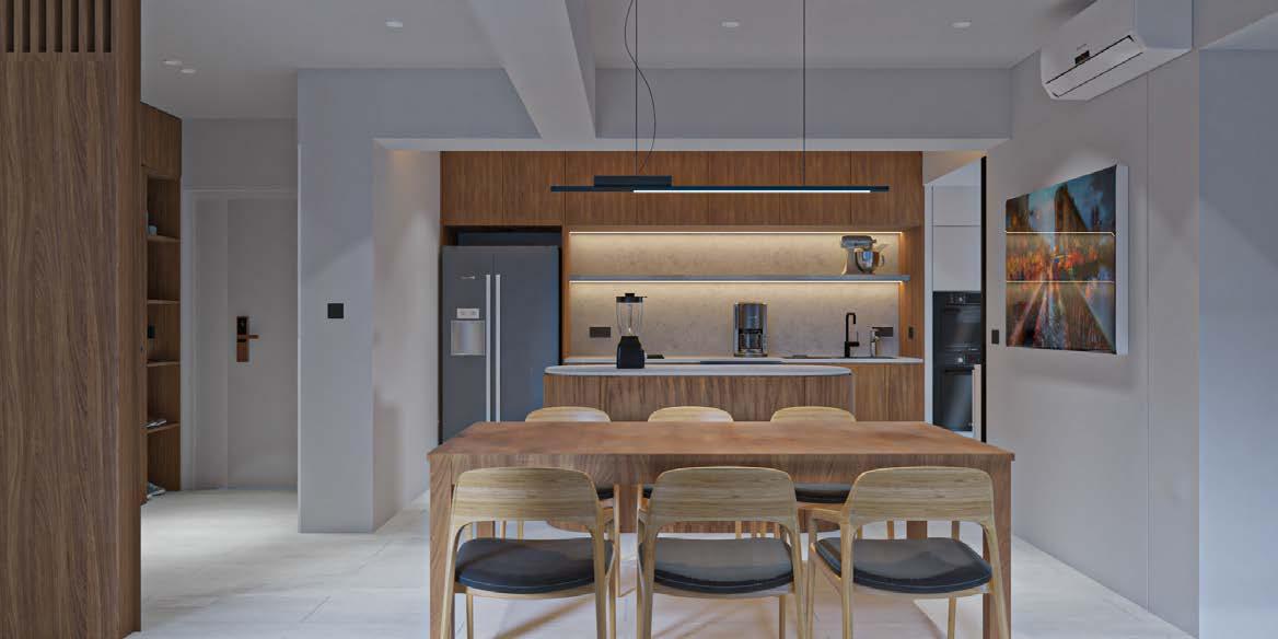 990平方尺,五室公寓私宅设计的最 大挑战是客户要求大量的储藏空间以 及各个角落/橱柜都必须容纳指定的物 品及指定数量的物品。同时也希望拥 有一个宽敞且空气流通的开放式空间 布局设计。