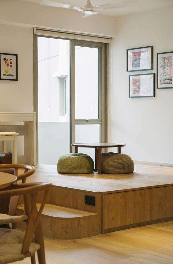 We integrated structures such as beams into part of our design. The strong wood veins and wood tone responsible to draw people attention to not focus on ceiling or walls.
