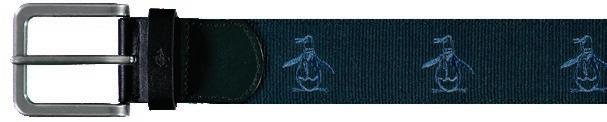 Reversible flat faced metal buckle with print new Penguin word mark and die cut out new PETE silhouette